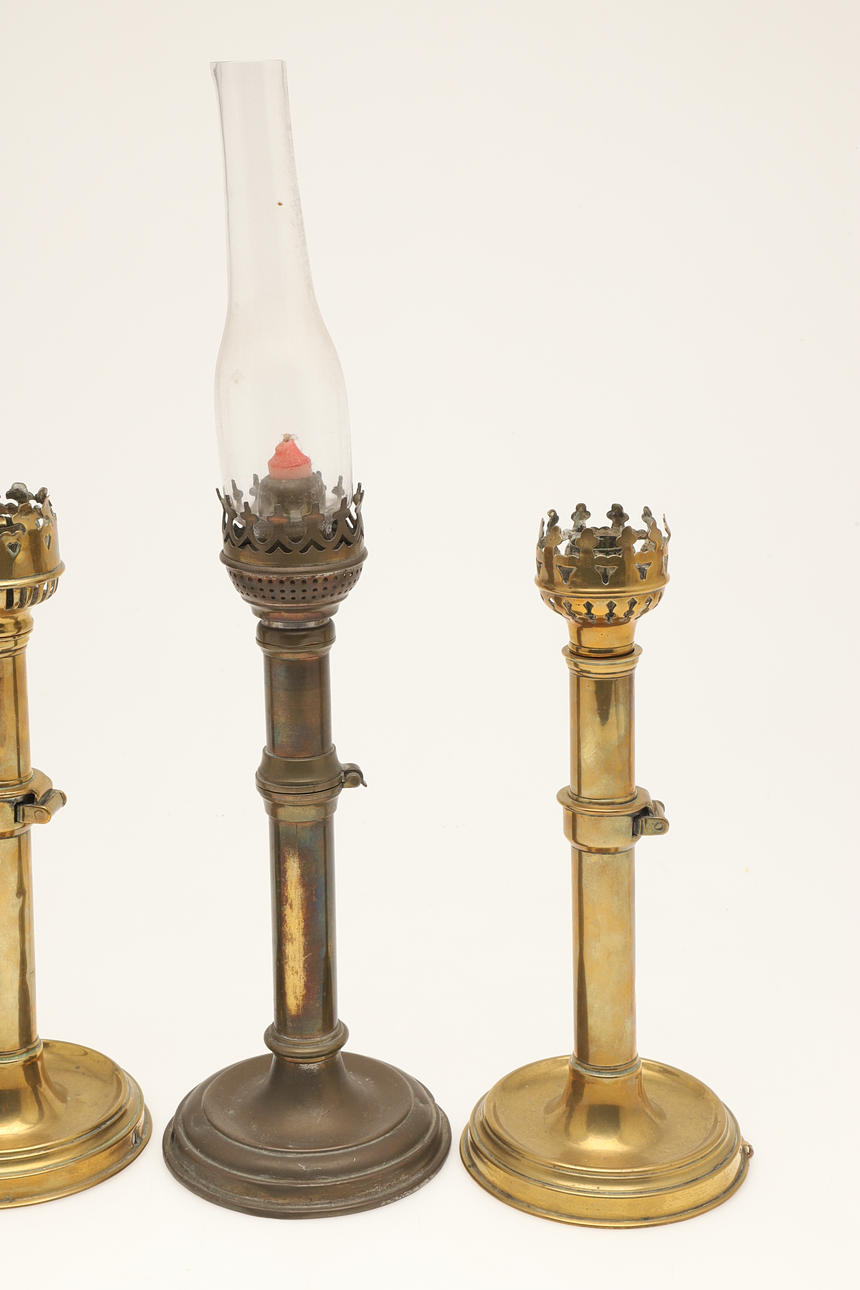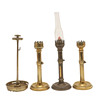 4537551. THREE HINGED AND ADJUSTABLE BRASS CANDLE HOLDERS AND A BRASS PRICKET CANDLESTICK.