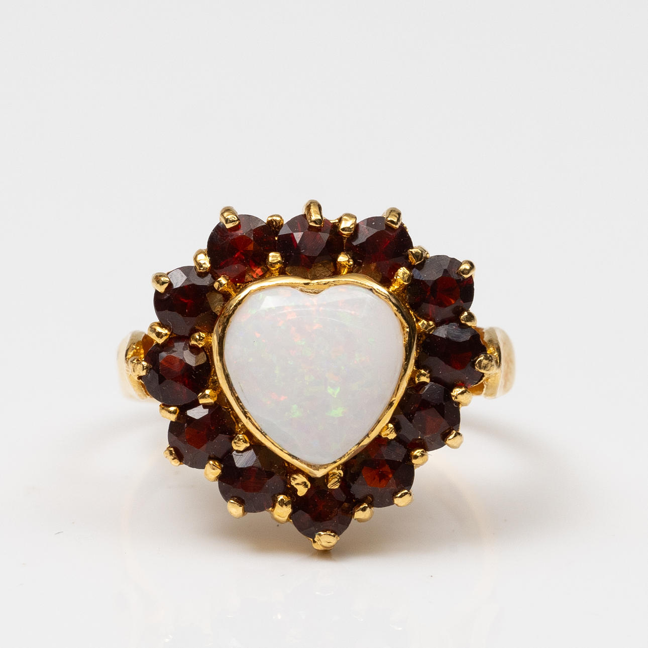 Carmosé ring in gilt sterling silver with a cut opal and brilliant cut garnets