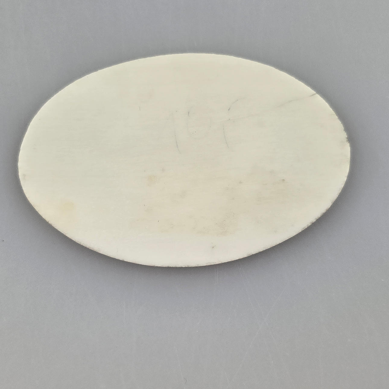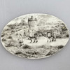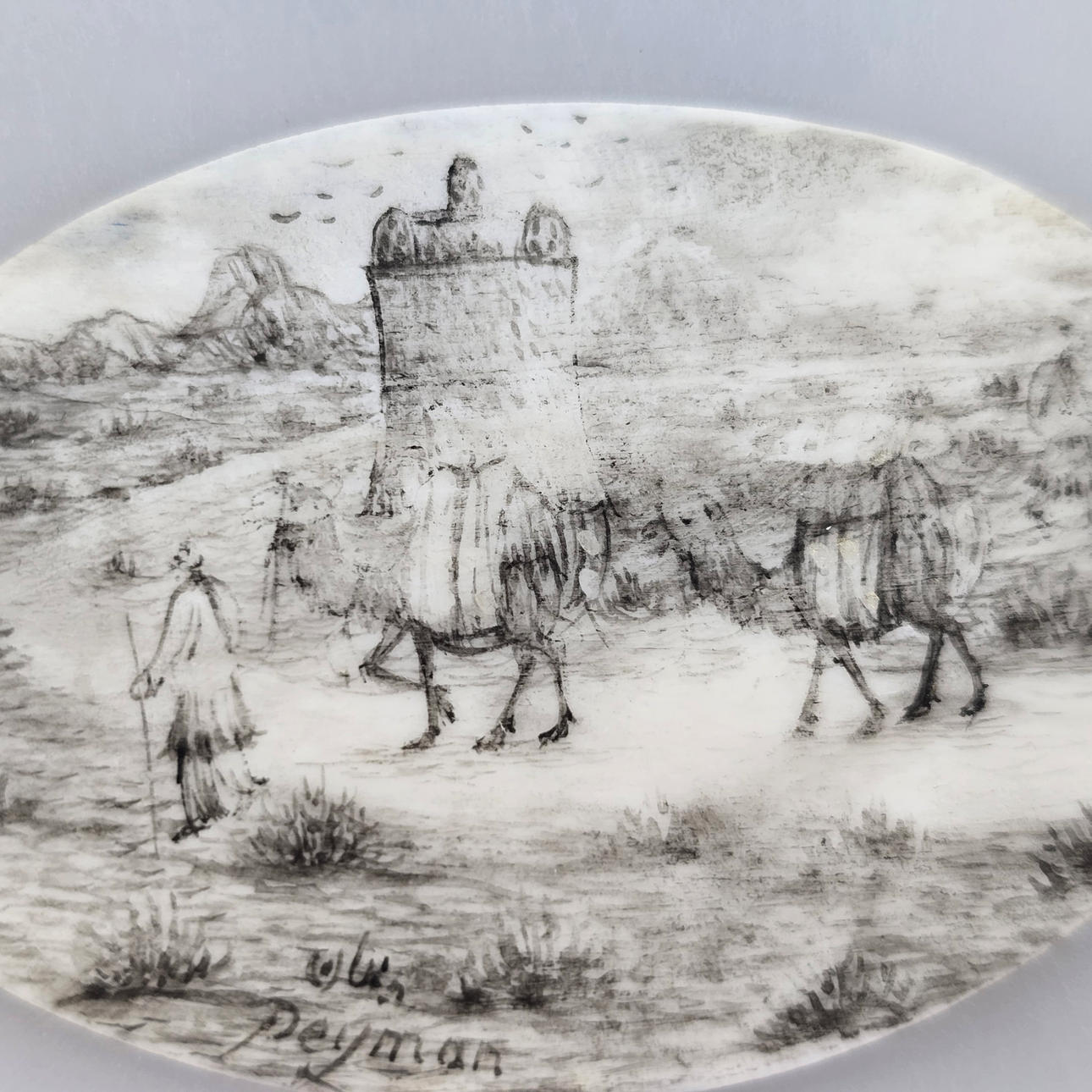 Oriental miniature painting - cameo painting in shades of gray partly painted gold, finely painted depiction of travelers with camels in front of tower architecture at a bend in the path, signed in curved calligraphy with Latin translation: “Peymak? “, 3.8 x 5.9 cm.