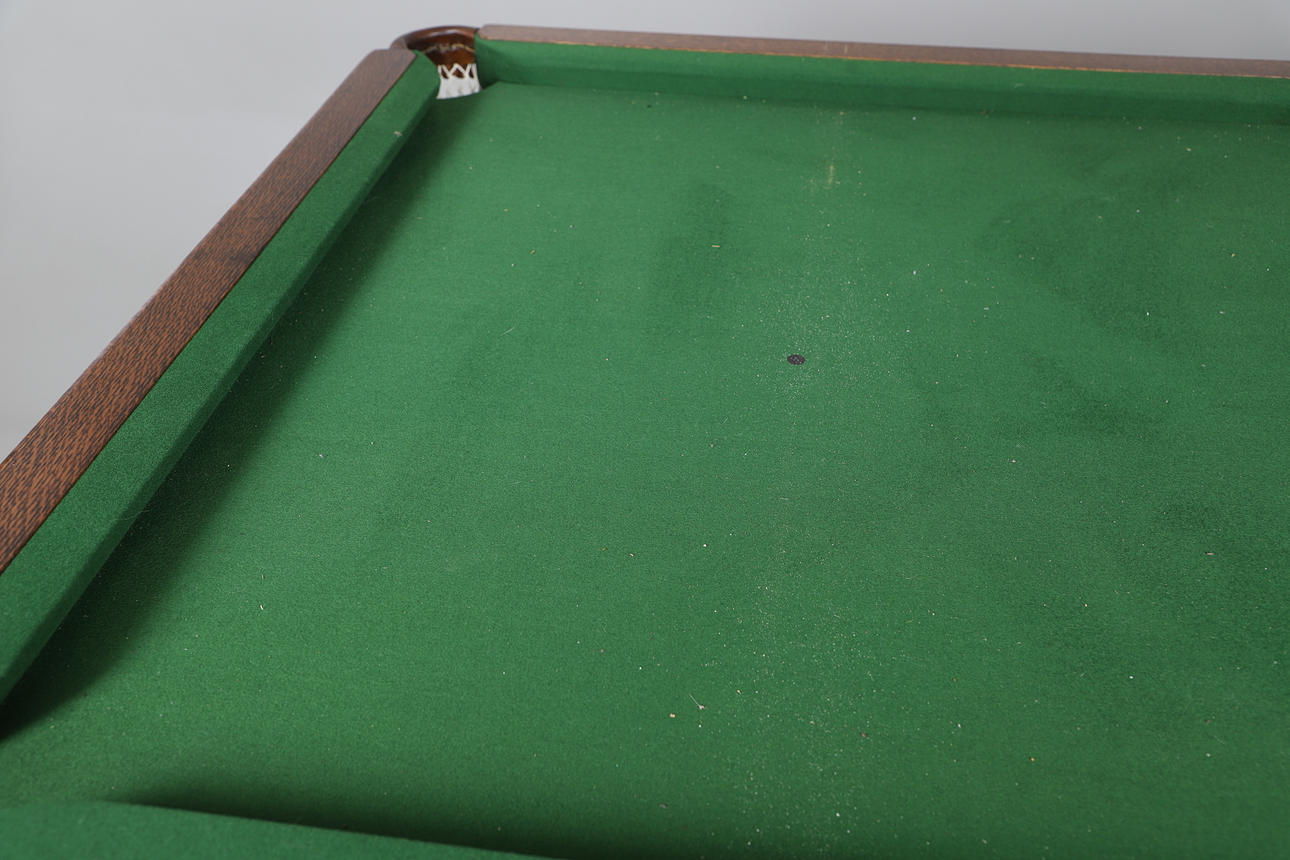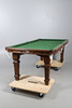 The slate bed billiard table supported on four tapering fluted legs, with four oak leaves to convert into a dining table. With various accessories including balls, table brush, etc. Table 200cms by 107cms overall including the leaves, 89cms high.