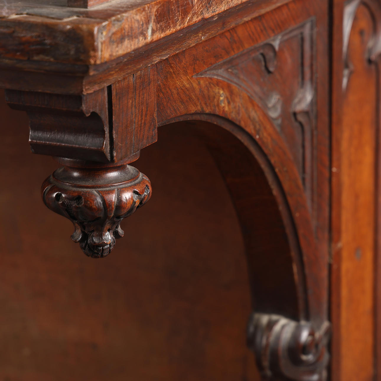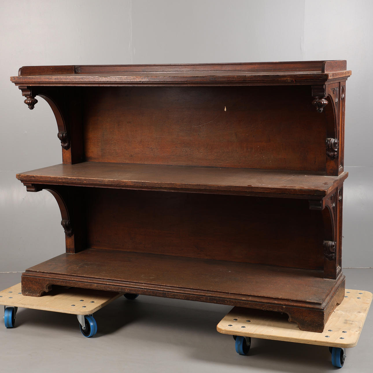 Having a raised gallery, above a Gothic tracery carved sides above two more tiers raised on bracket feet, 152cm wide 116cm high 57cm deep.