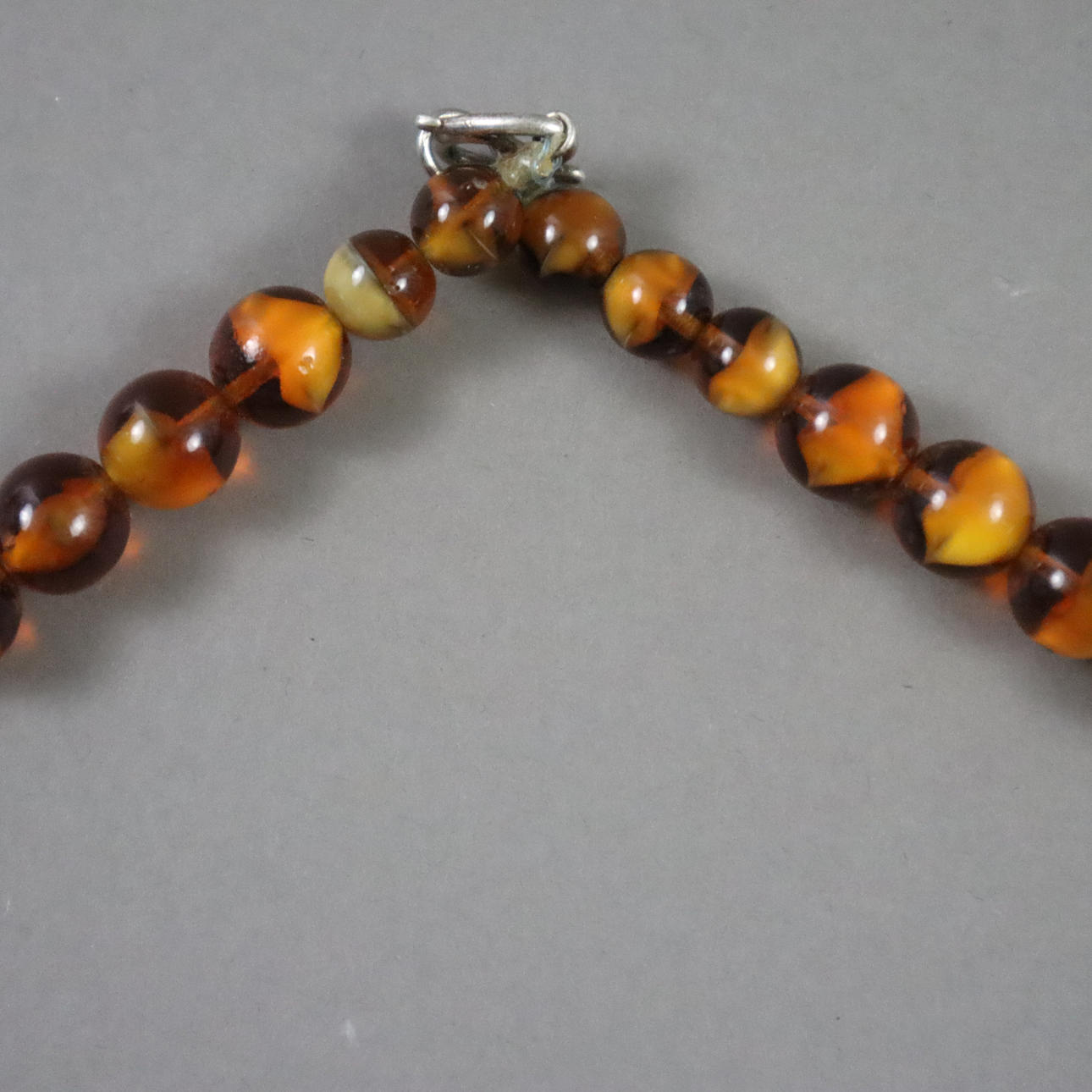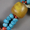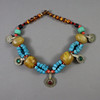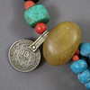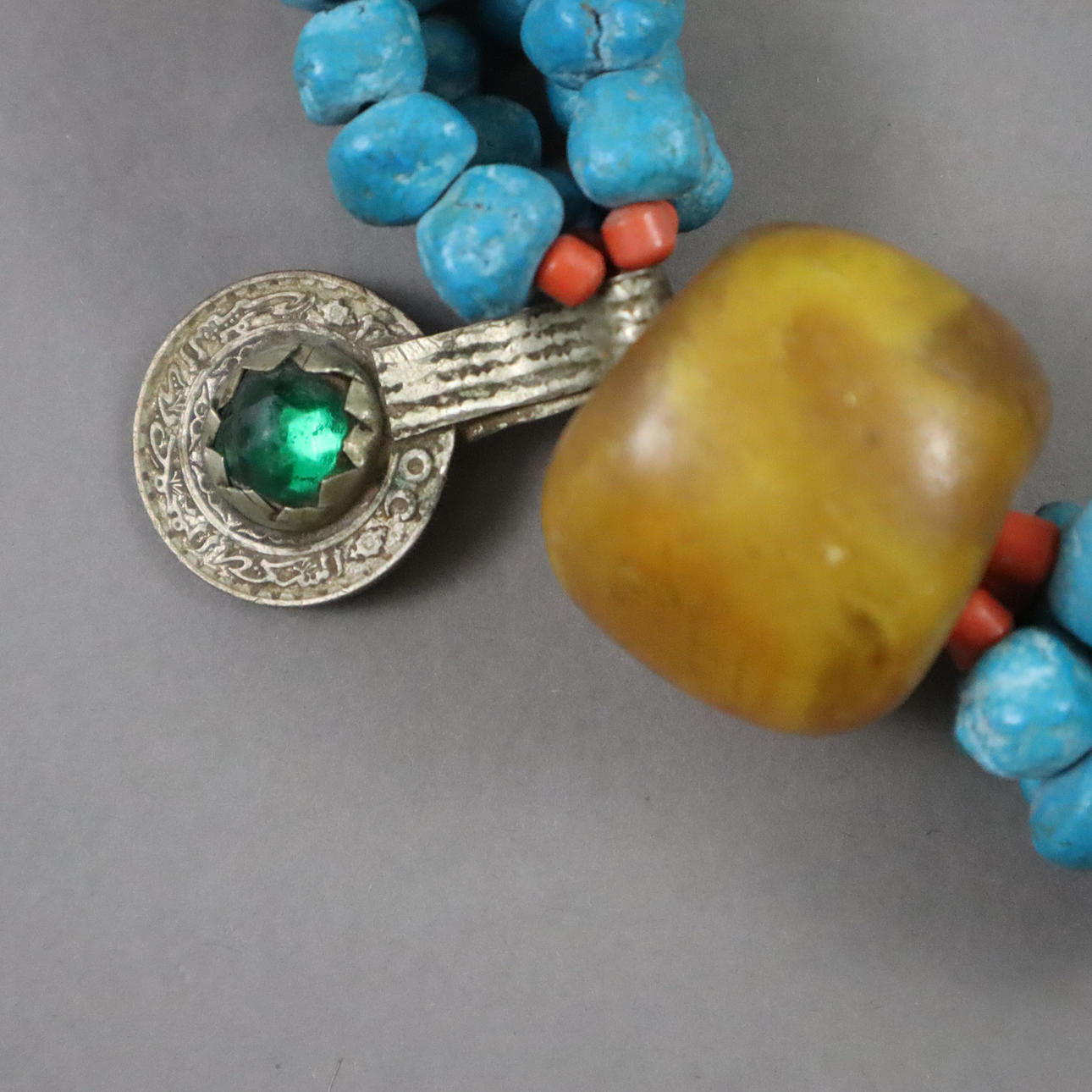 partly multi-row necklace made of colored stones, glass beads, amber mass beads, etc., with five Moroccan coins, partly set with colored stones, hook closure,