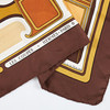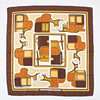 Foulard side. Design Françoise De La Perriere in 1970. Motif of, among other things, parts of horse-drawn carriages against a light bottom and with a brown border. Signed and marked “HERMÈS-PARIS” with copyright.
