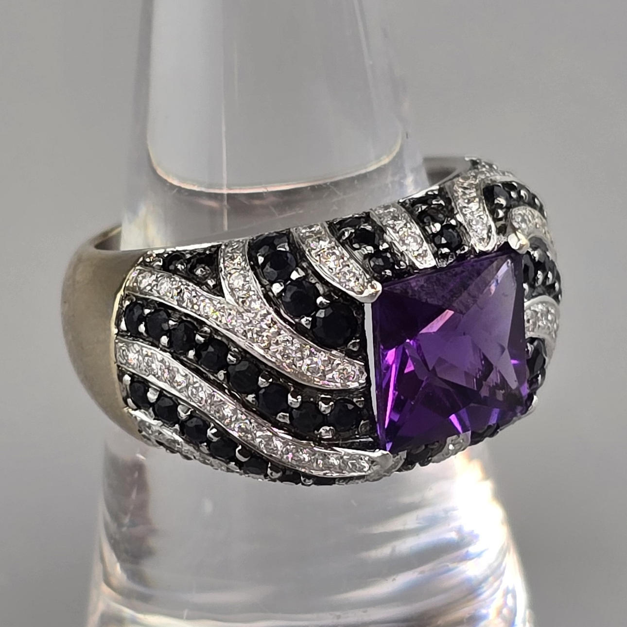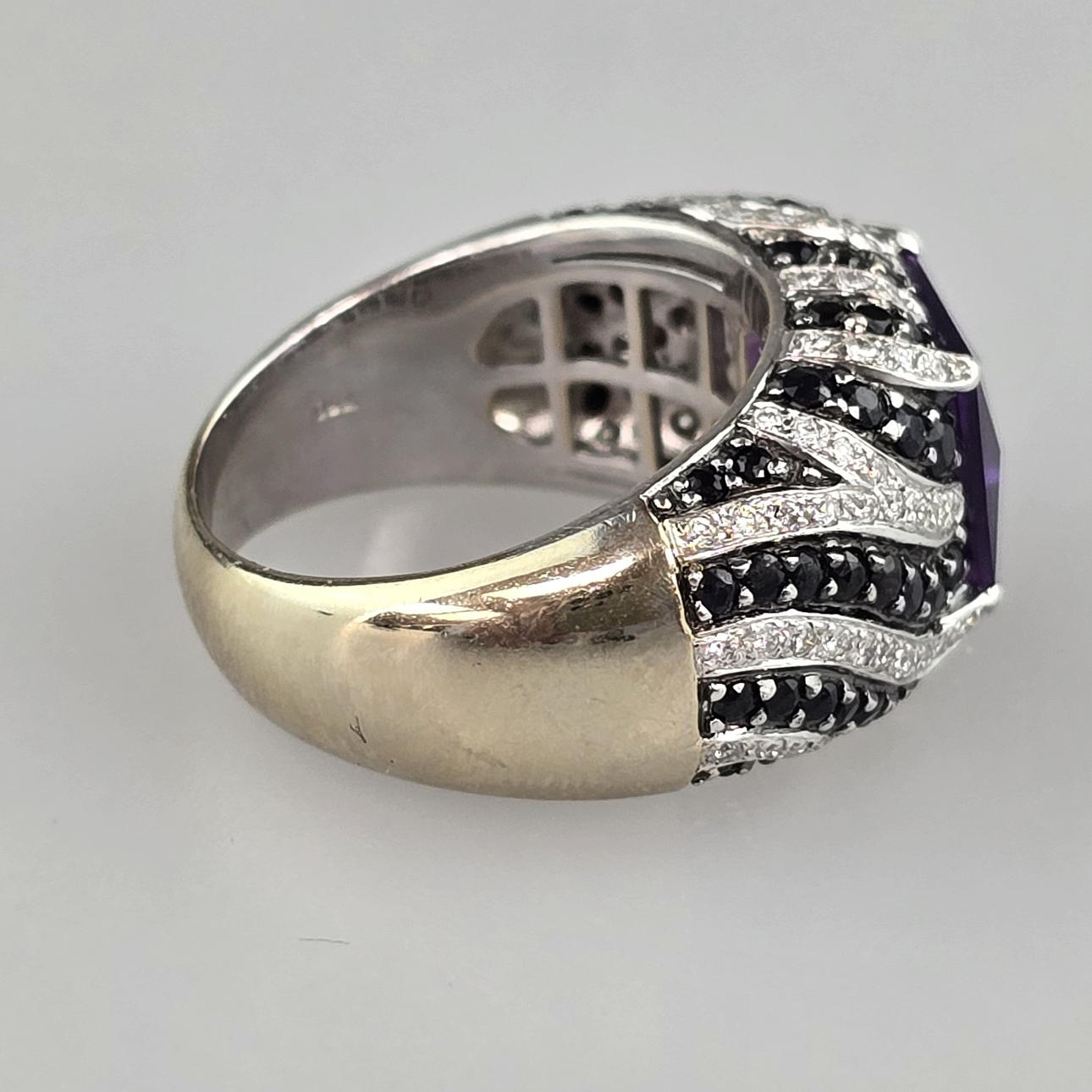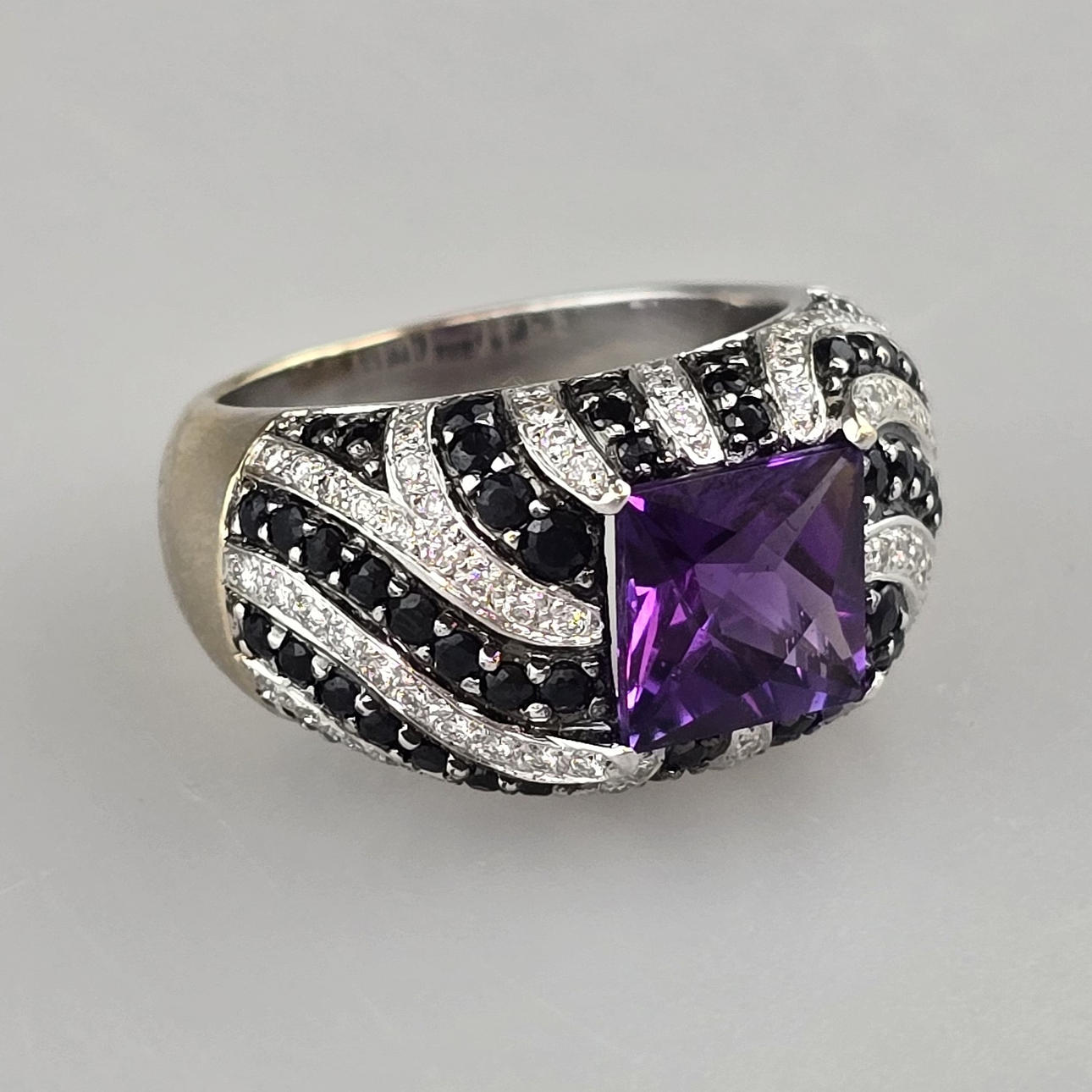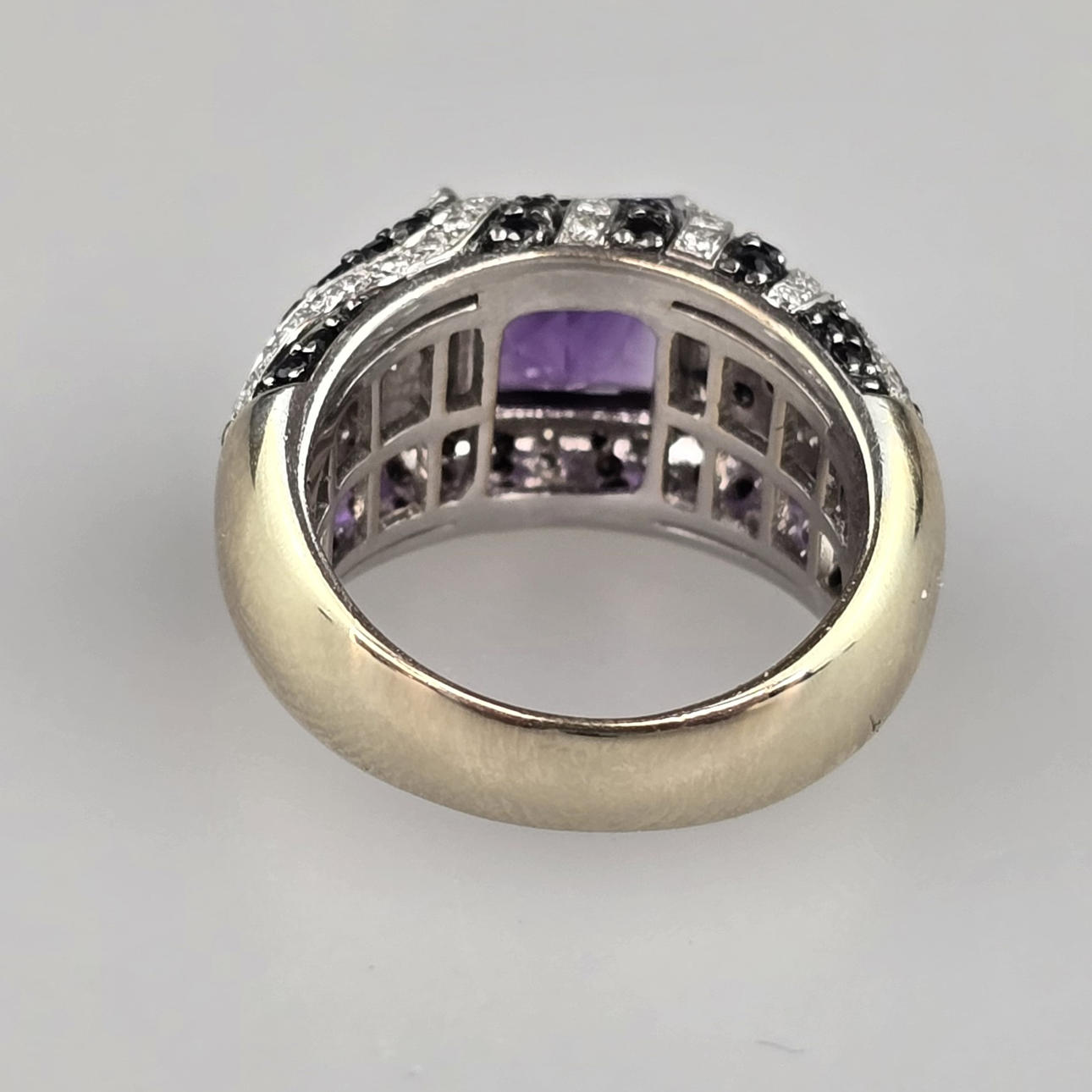 18K diamond/amethyst ring - yellow/white gold 750/000 (18K), stamped, ring head set in wavy lines with small black and white diamonds alternating in total approx. 2 carats. (white diamonds TW/VS), centrally set with simple cushion cut amethyst of ca. 2,5 ct., B. ring head ca. 12mm, diameter Rail ca. 17.8 mm (size 56), weight approx. 13.6 g.