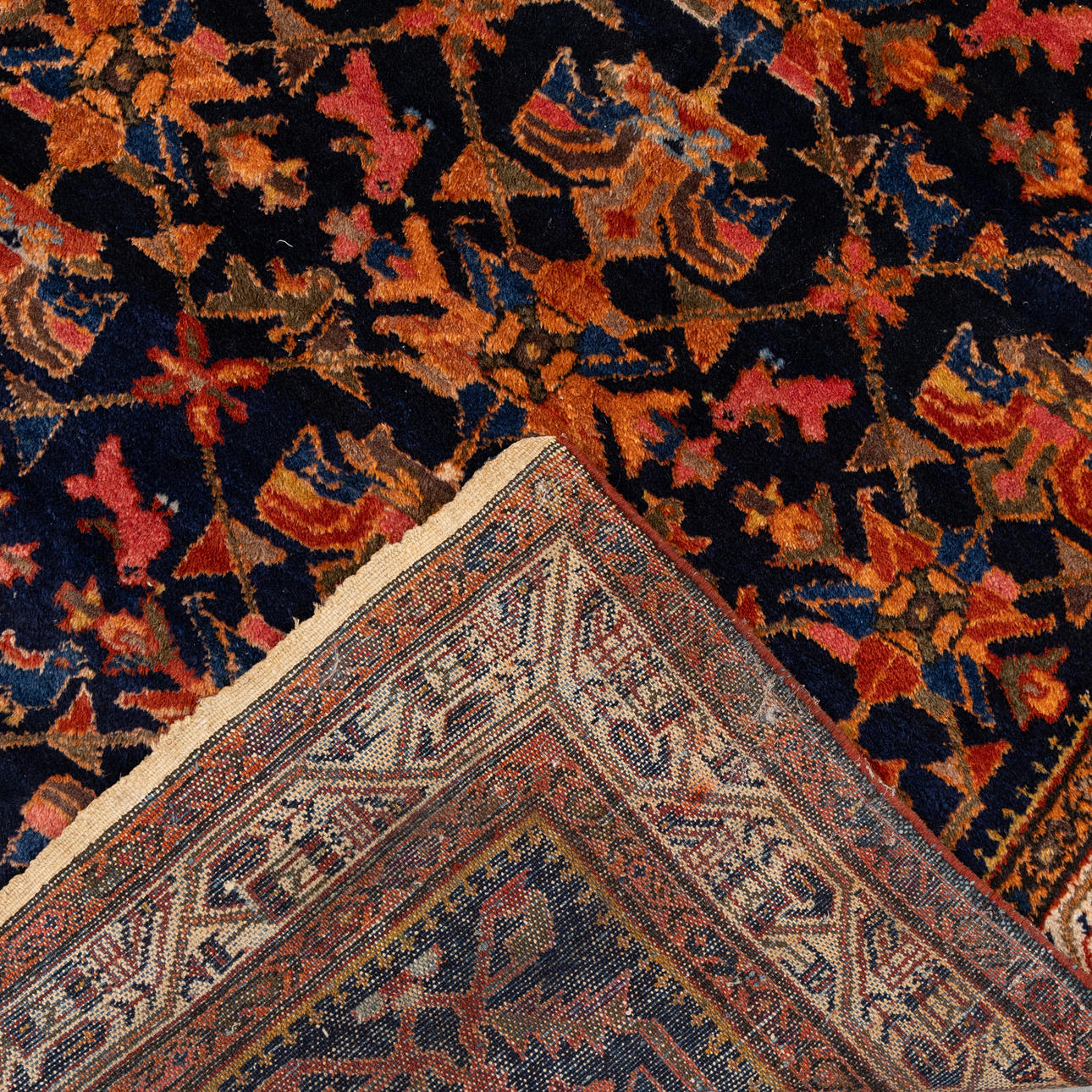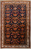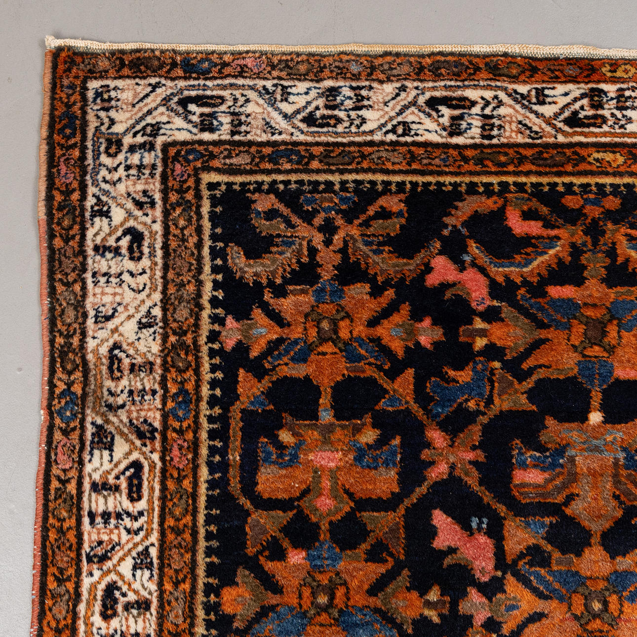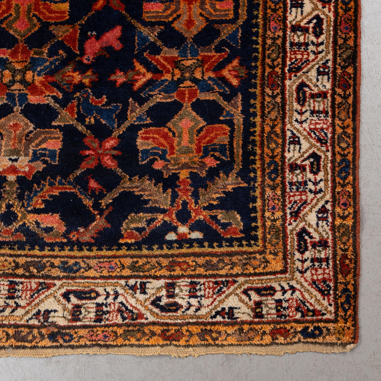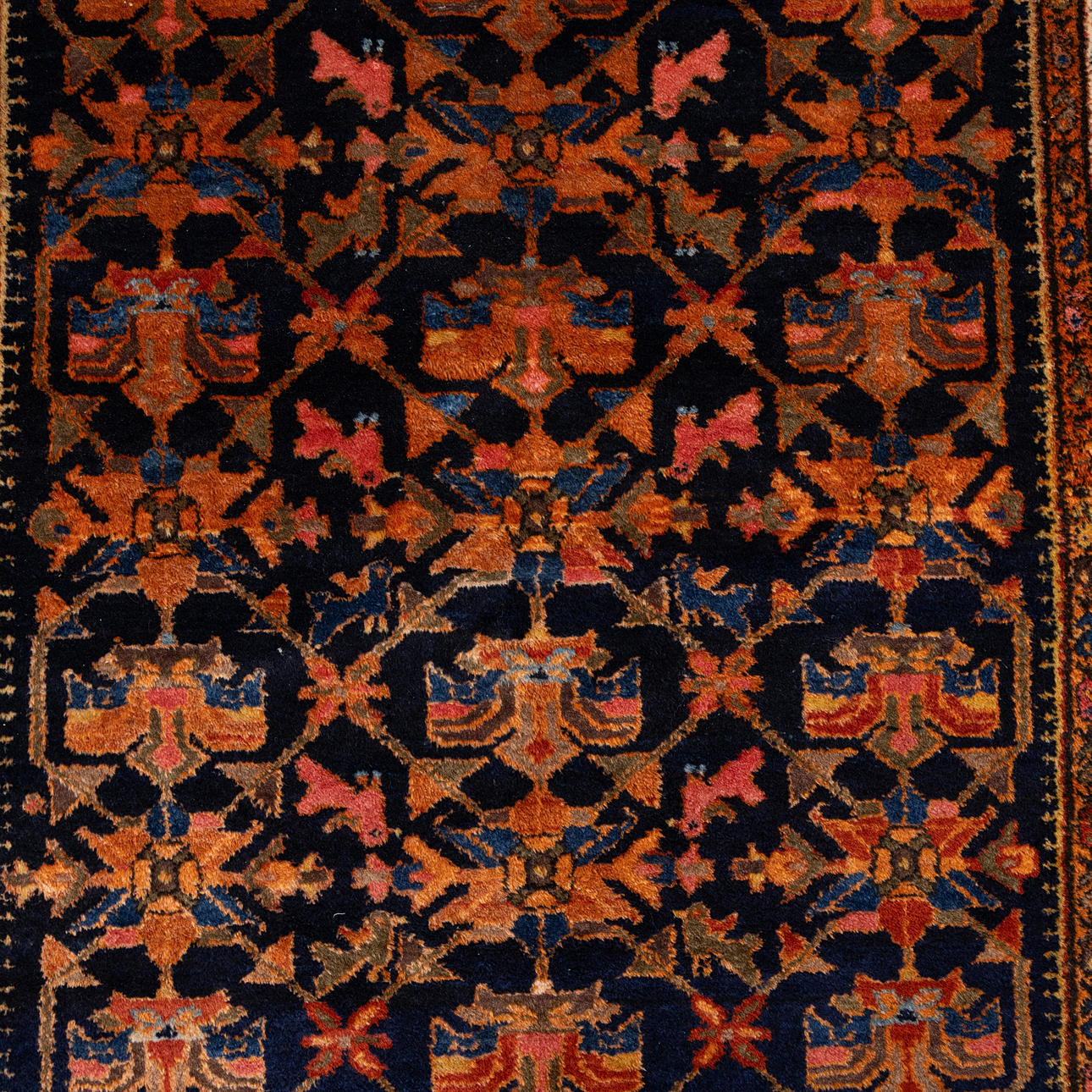 Hand-knotted carpet in wool on cotton warp, repeating polychrome pattern on dark blue base.