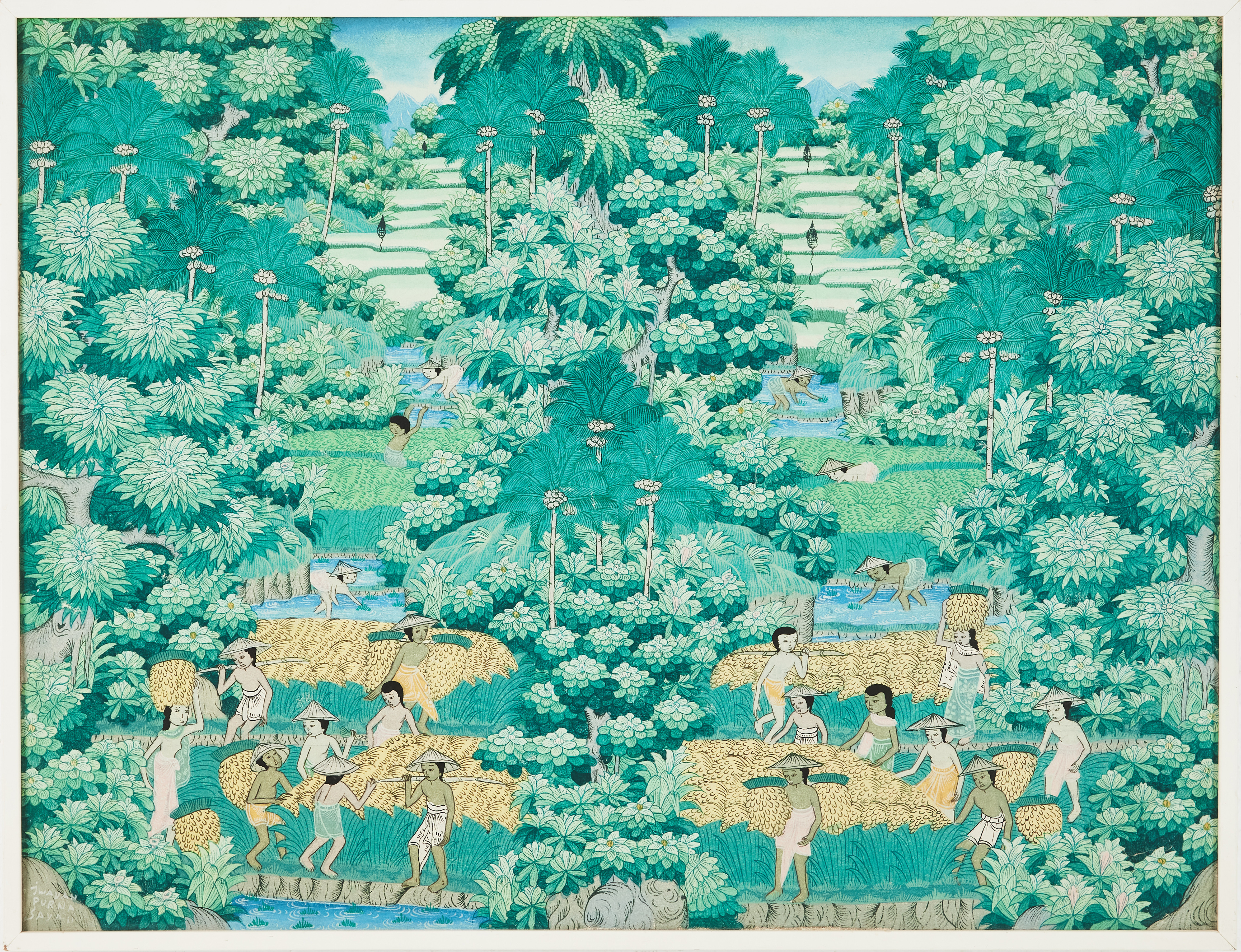 4549663. OIDENTIFIERAD KONSTNÄR (BALI, 1900-TAL). Harvest field, oil on canvas, signed Iwayan Purna Sayru.