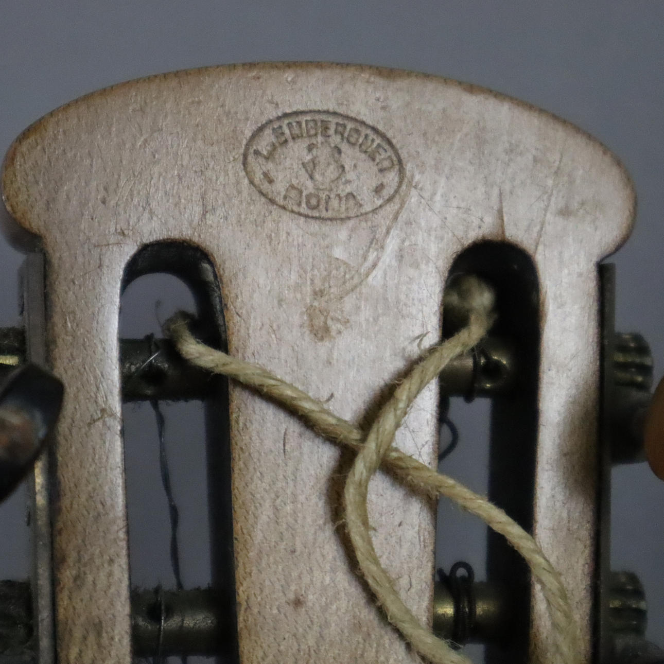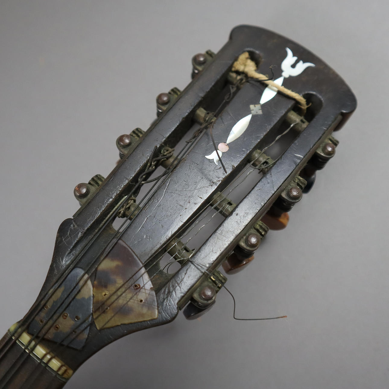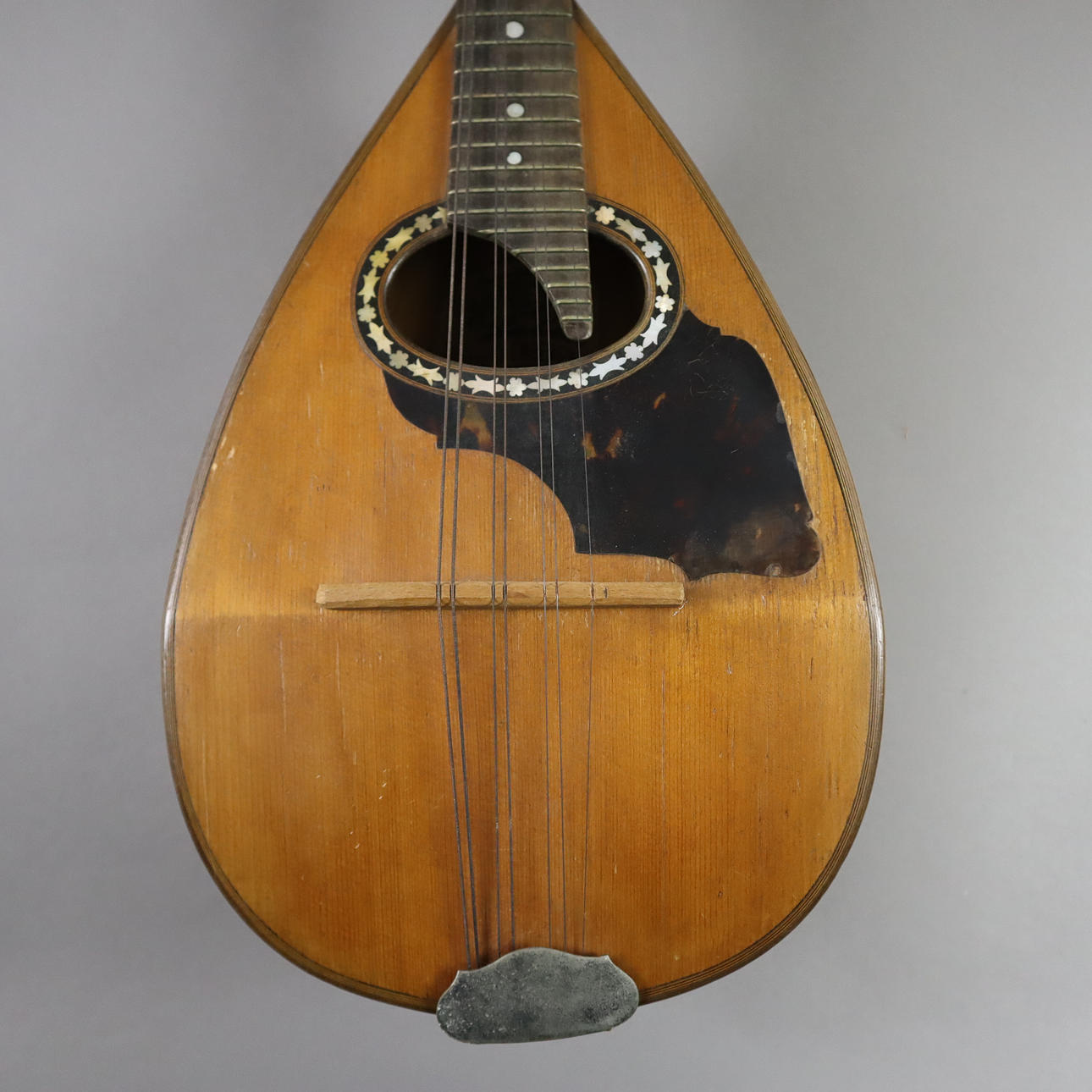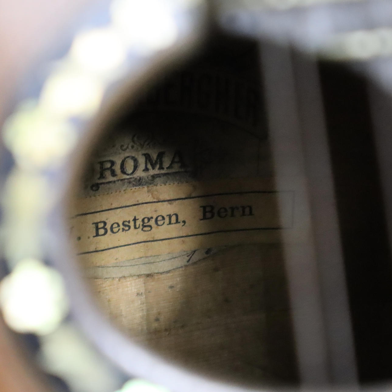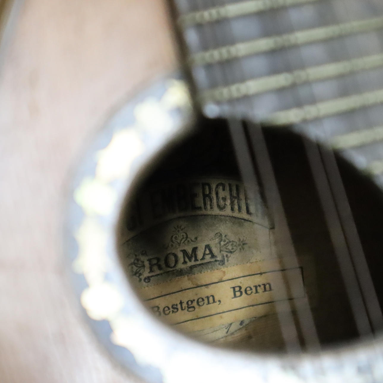 Company note inside Luigi Emberger Roma, above it another note: W. Bestgen Bern, sound box with curved bottom, front with tortoiseshell inlay and mother of pearl, company logo,