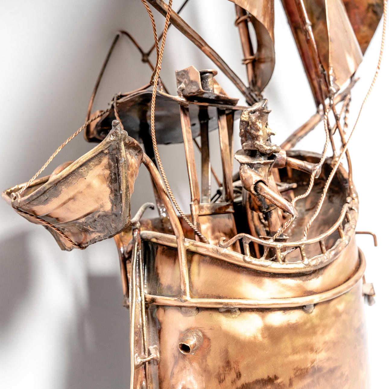 Wall sculpture depicting a ship, made of copper sheet and copper wire