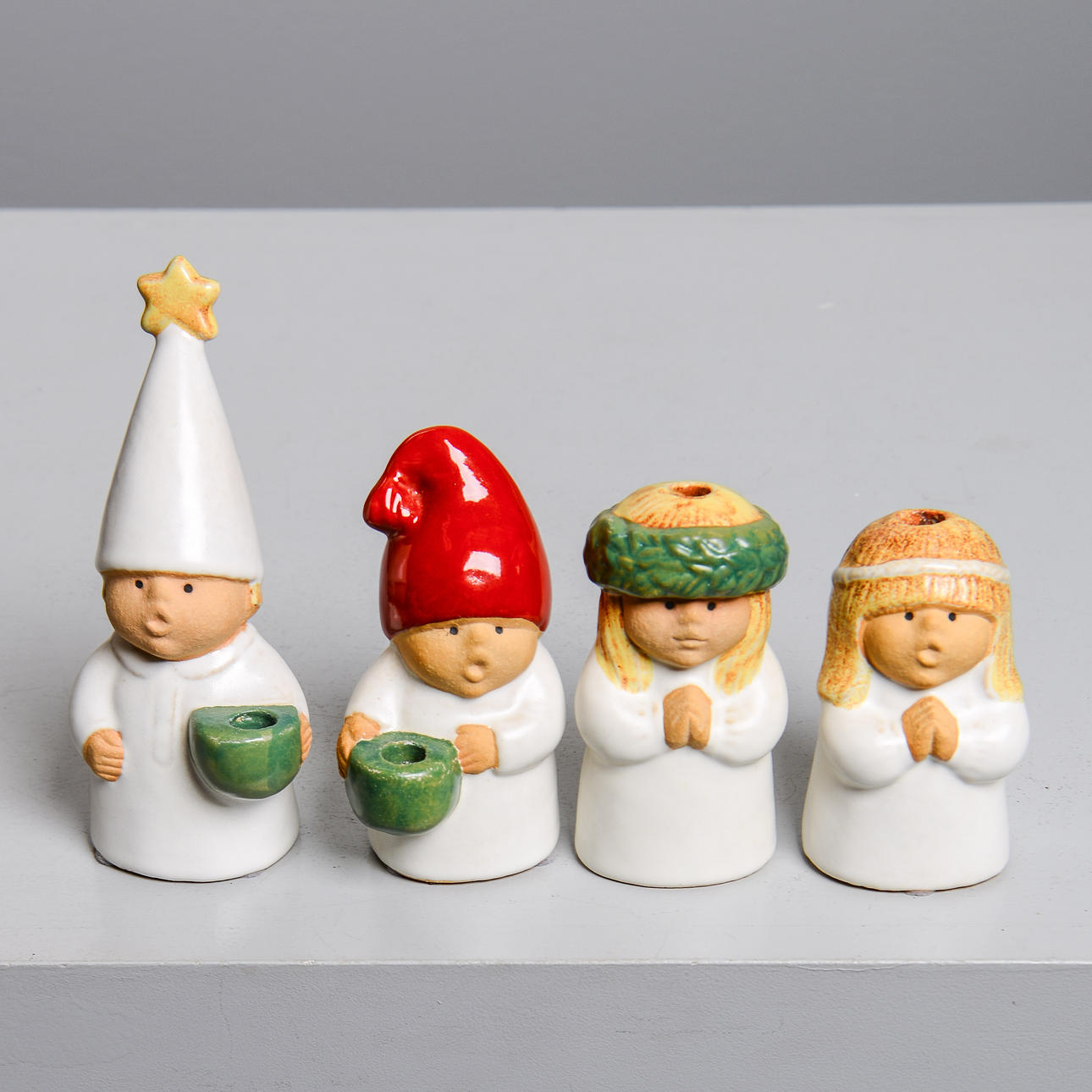 Partially glazed stoneware. 4 candlesticks “Advent” in the form of Santa Claus, Dice, Lucia and Star Gosse. Height from 11 to 18 cm.