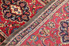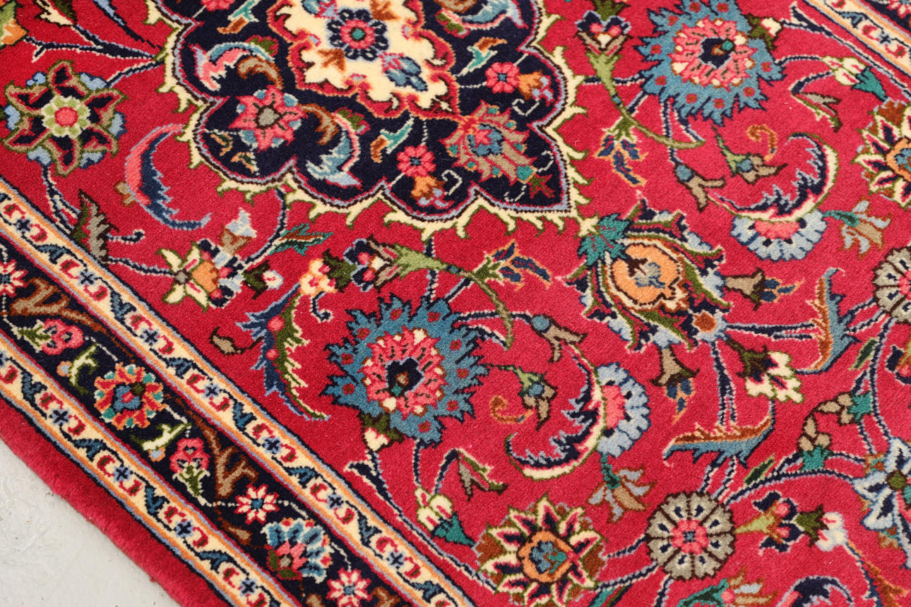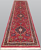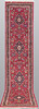 This gallery model Meshed rug features a red center field with several medallions placed in a row along the center axis. The pattern consists of stylized flowers and leaf ornaments of various shades.