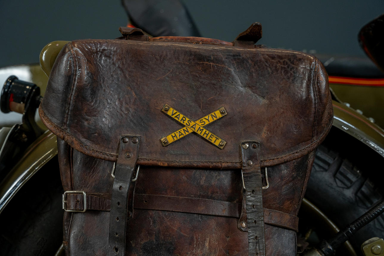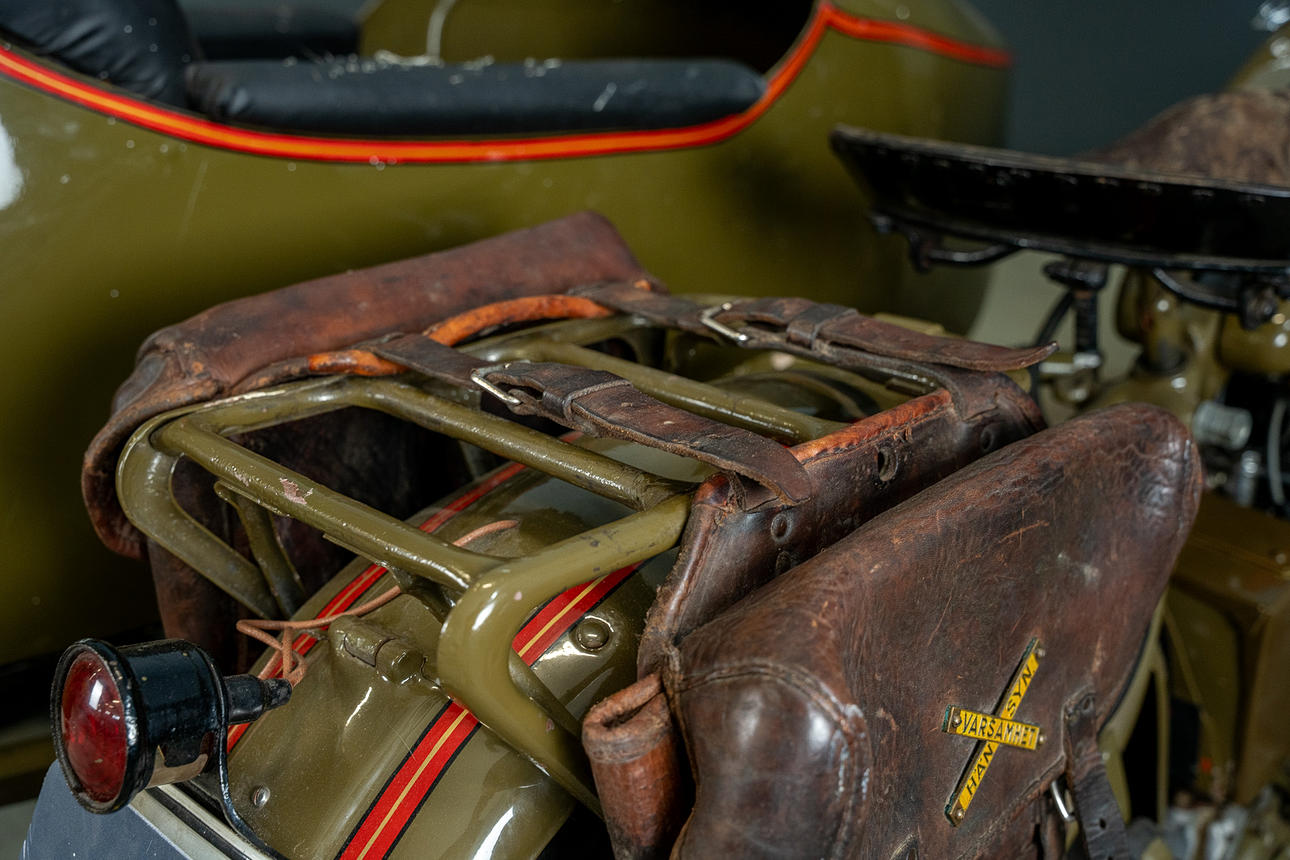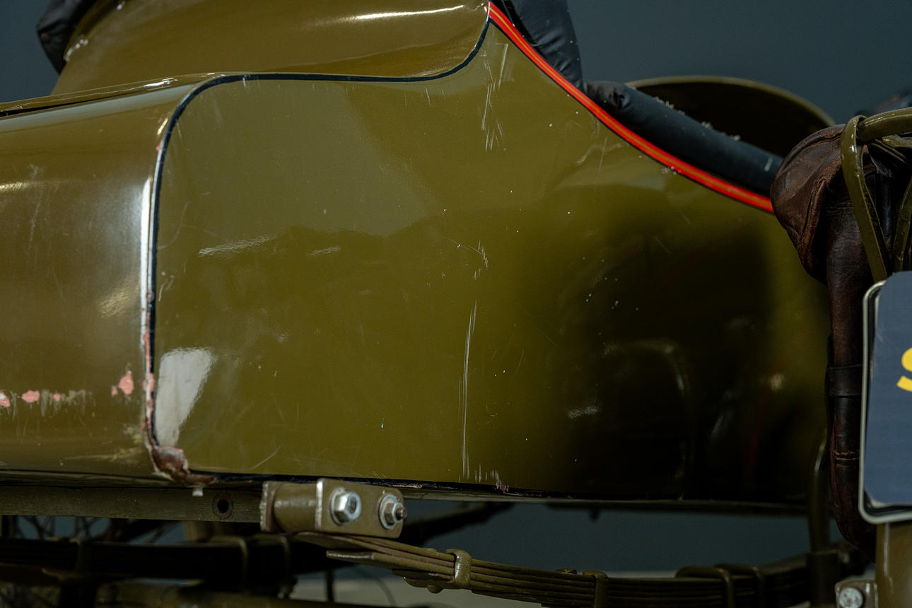 Dents and marks appear on the sidecar basket and lantern, for example.