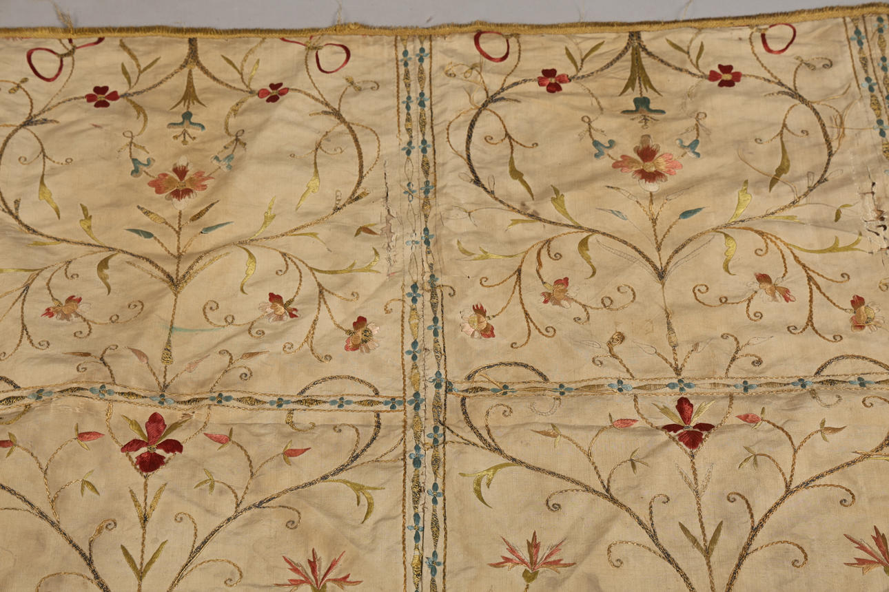 Having a silk thread with a floral design, possibly from a larger piece, 188cm x 97cm.