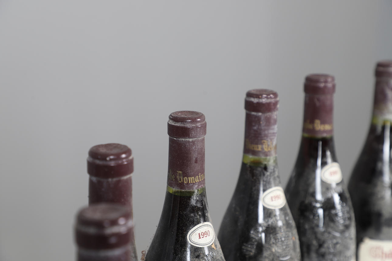 8 bottles of Chateauneuf du Pape Vieux Telegraphe 1990, in an old wooden case (not the original case). 750ml, bottles 30cms high, wooden case 50cms by 34cms by 19cms high
