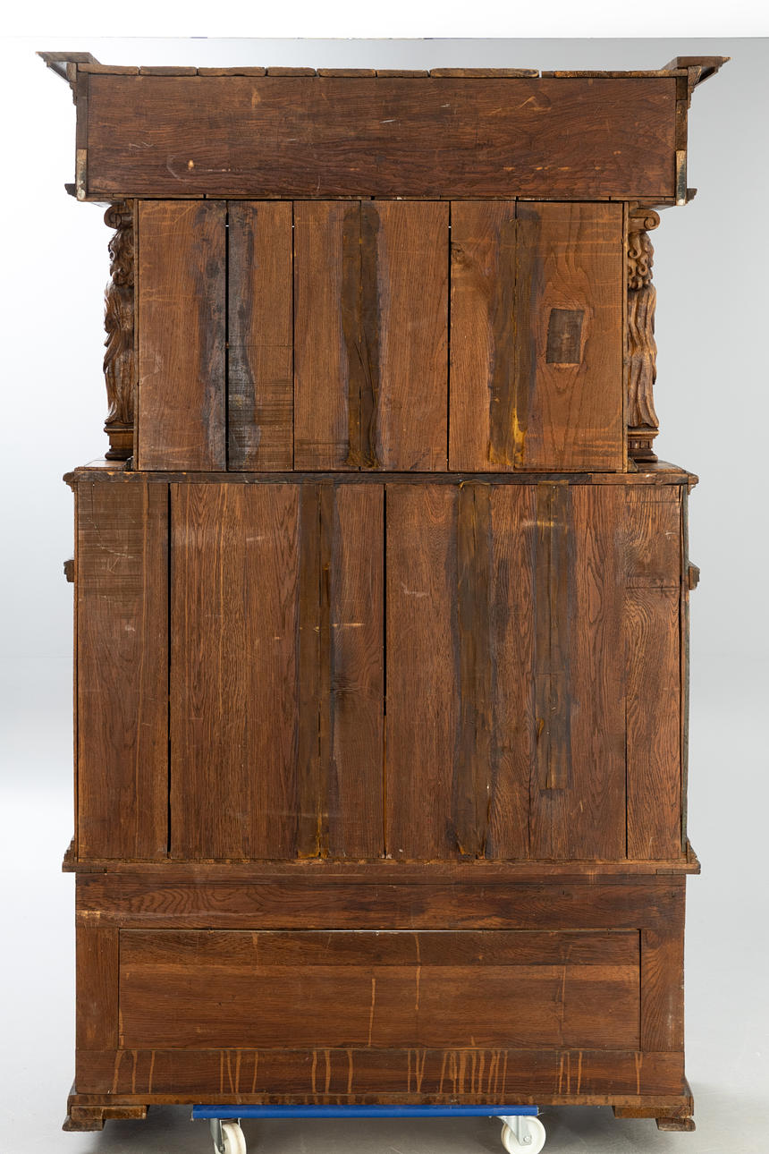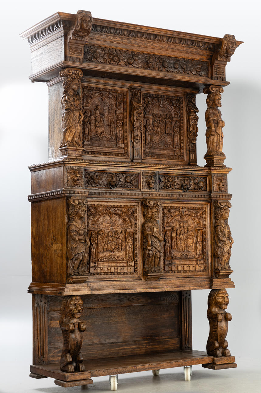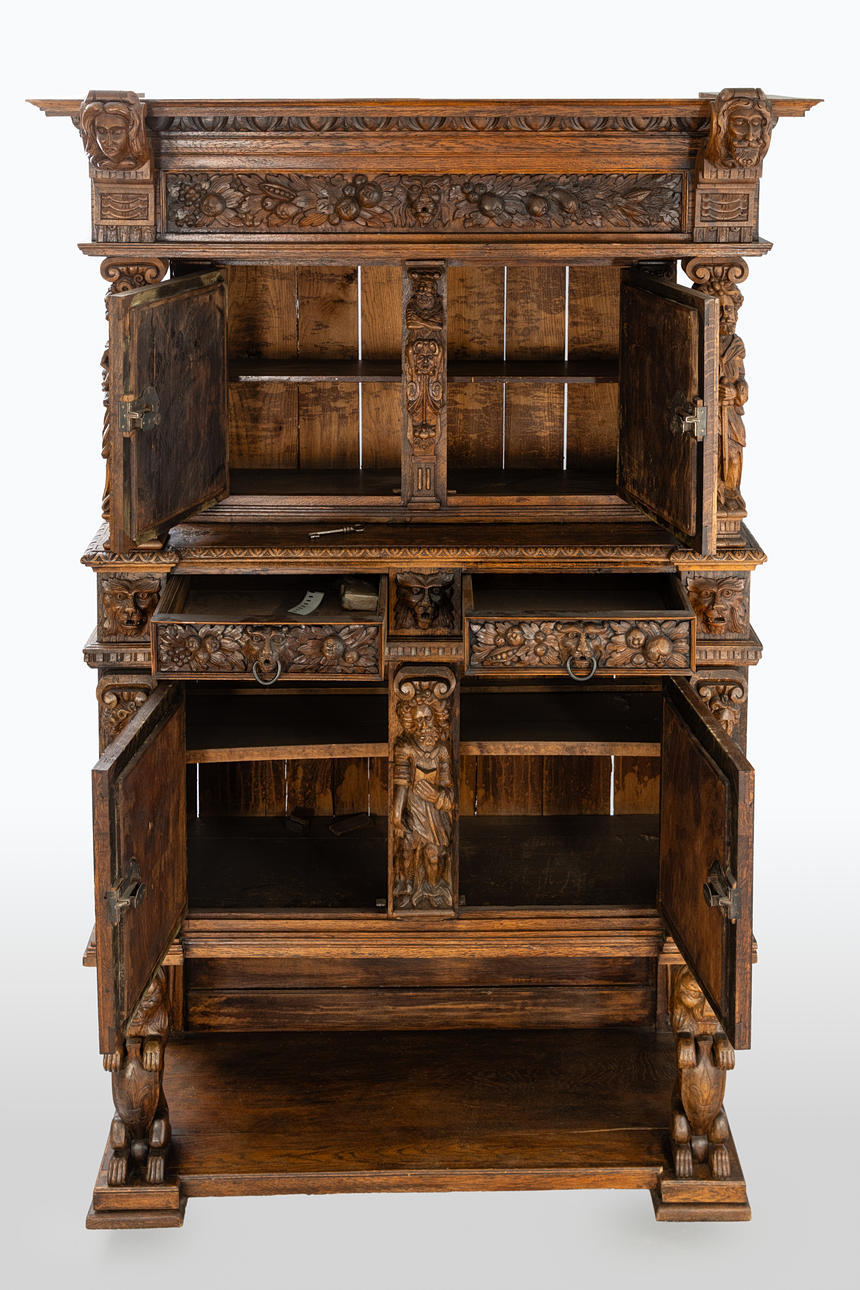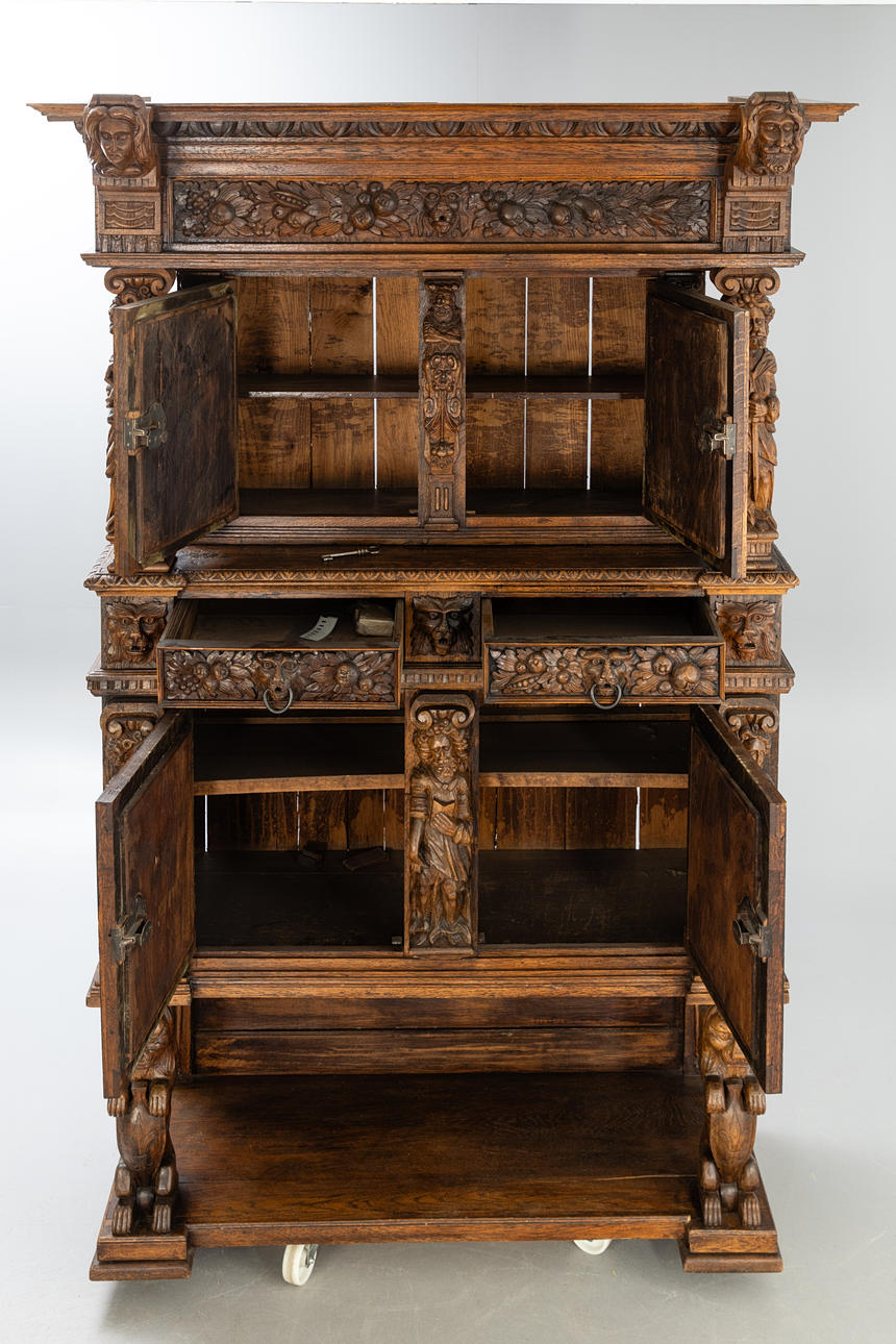 Cut oak. Triple-layered body The open base in the front, on the side, two sculptural lions as supporting figures, the two upper floors divided by figure pilasters.