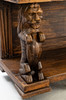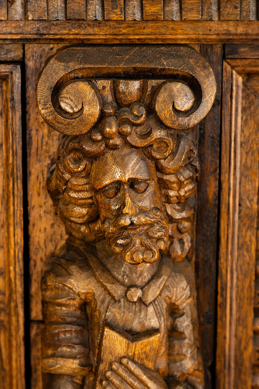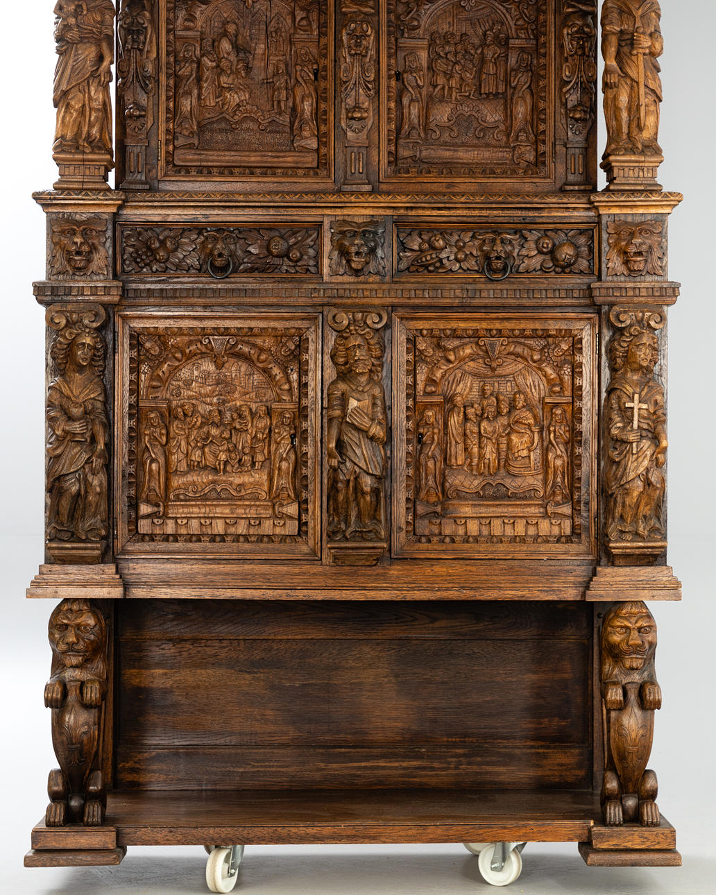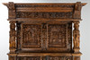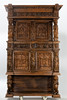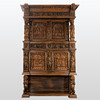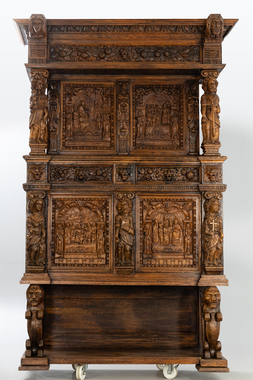 Cut oak. Triple-layered body The open base in the front, on the side, two sculptural lions as supporting figures, the two upper floors divided by figure pilasters.