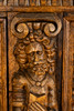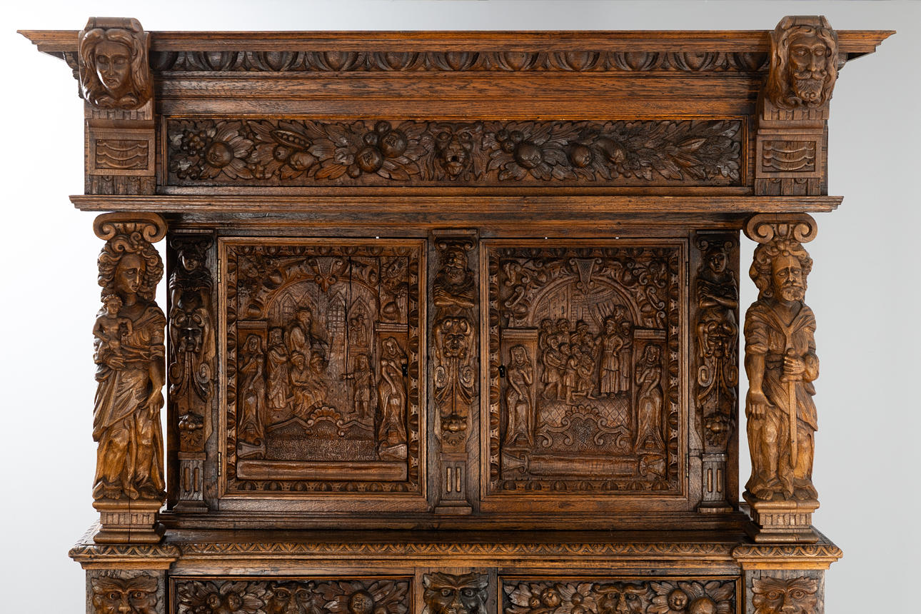 Scenes from the Bible in the five door panels. Lion masquarons and fruit friezes on the door panels and gable field. Slightly projecting, profiled gable wreath.