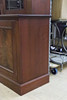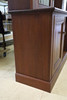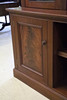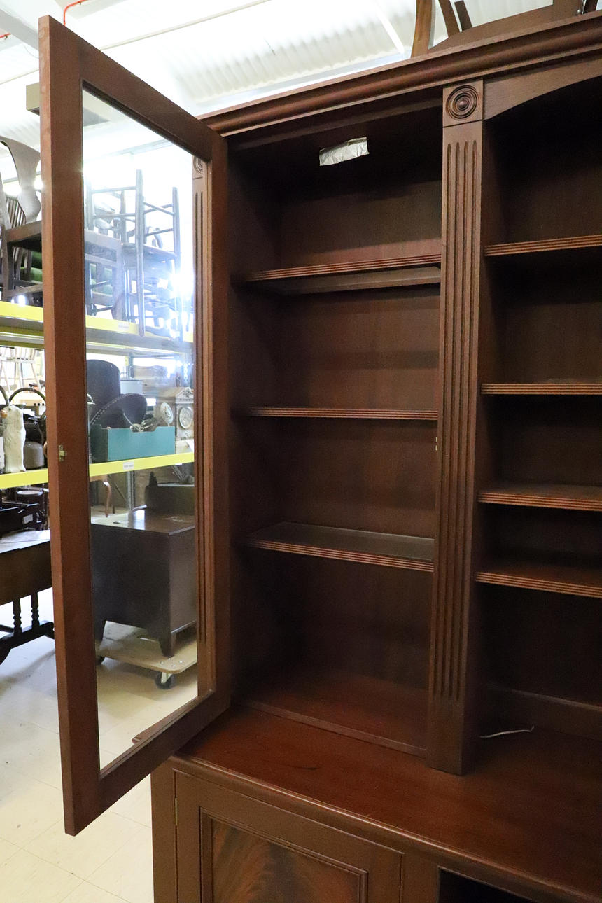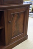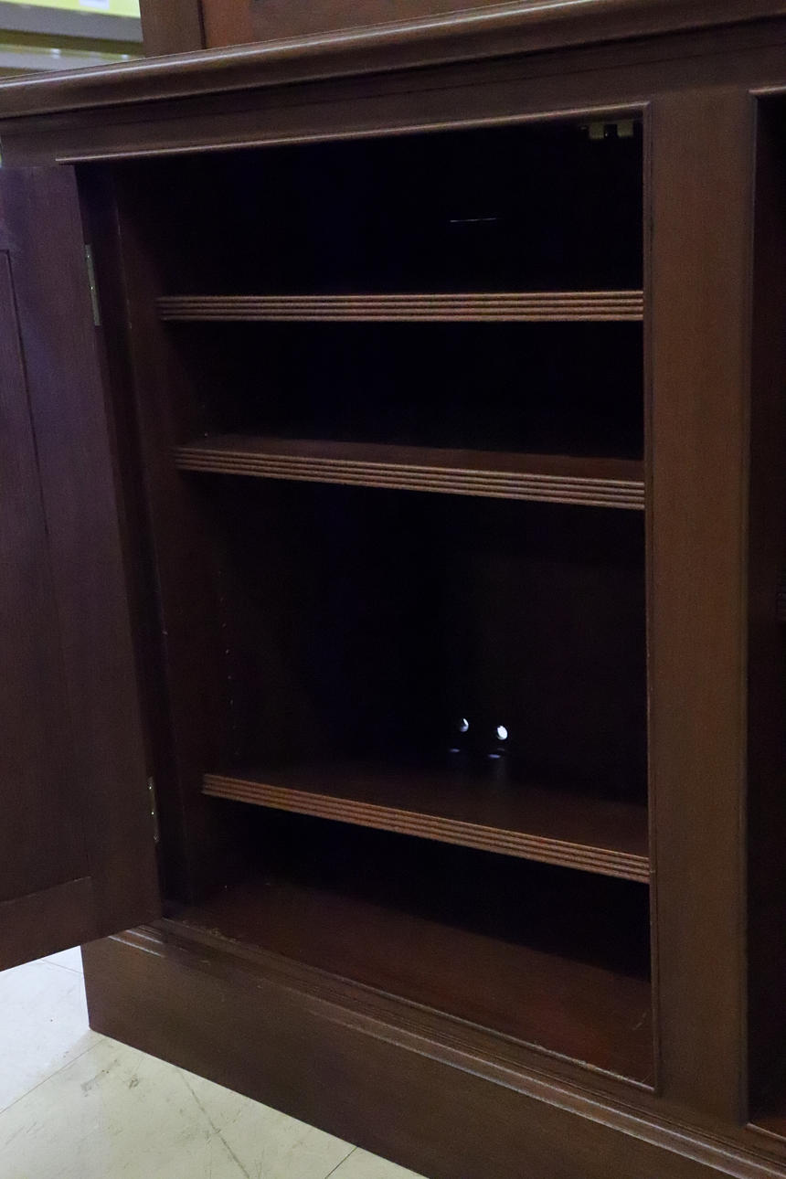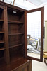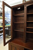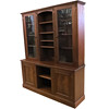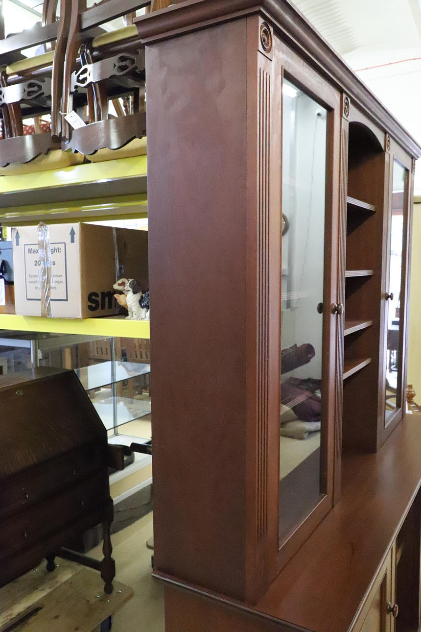 In two sections, the top section features two glazed cupboard doors with interior shelving, either side of a central open shelf area. Featuring fluted details to the top. Above a cupboard base with two single cupboards with interior shelves, either side of an open shelf area. Height 218cm, width 183cm, depth 50cm.