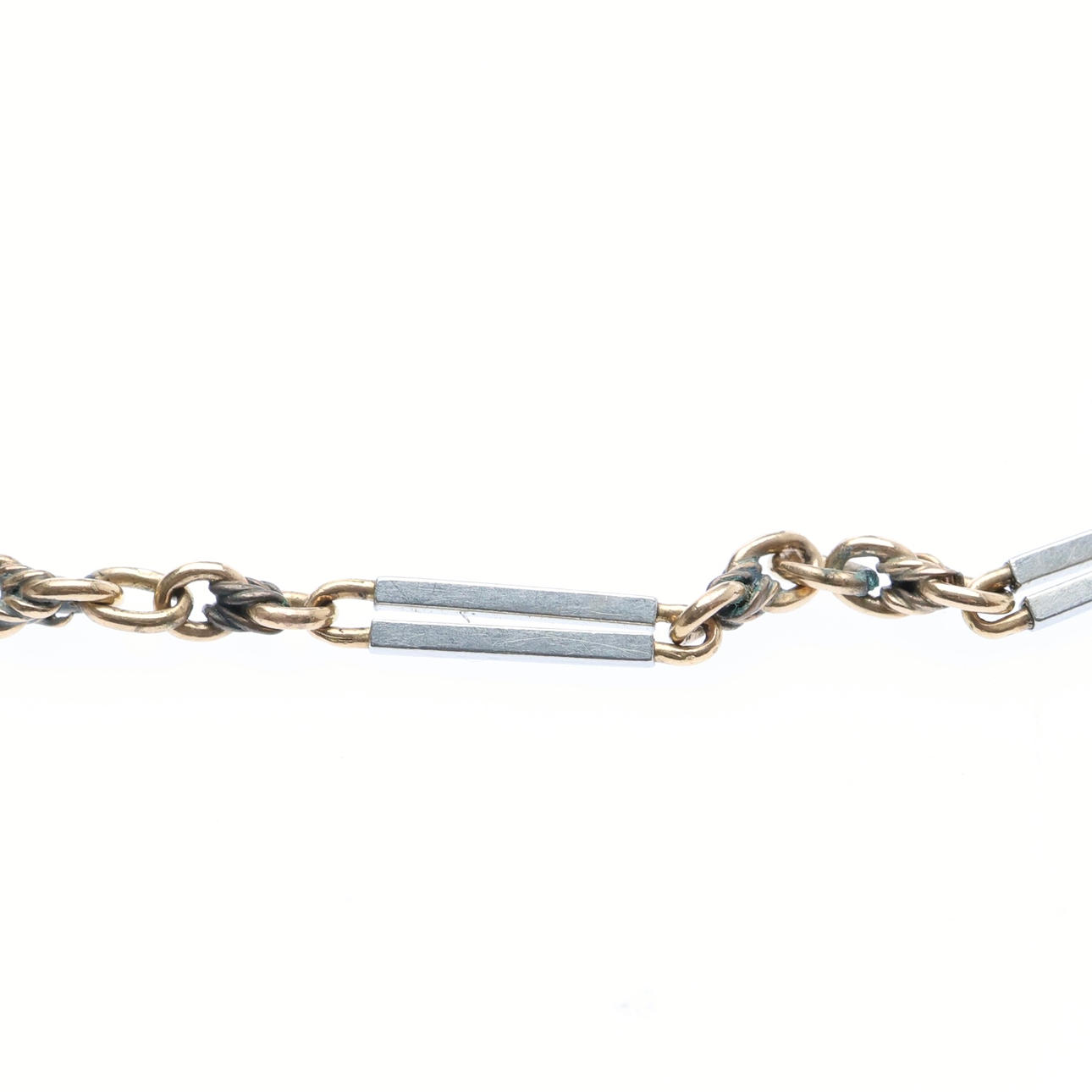 Commensurate with age and use. Two white link bent, others with slight nicks and dents.