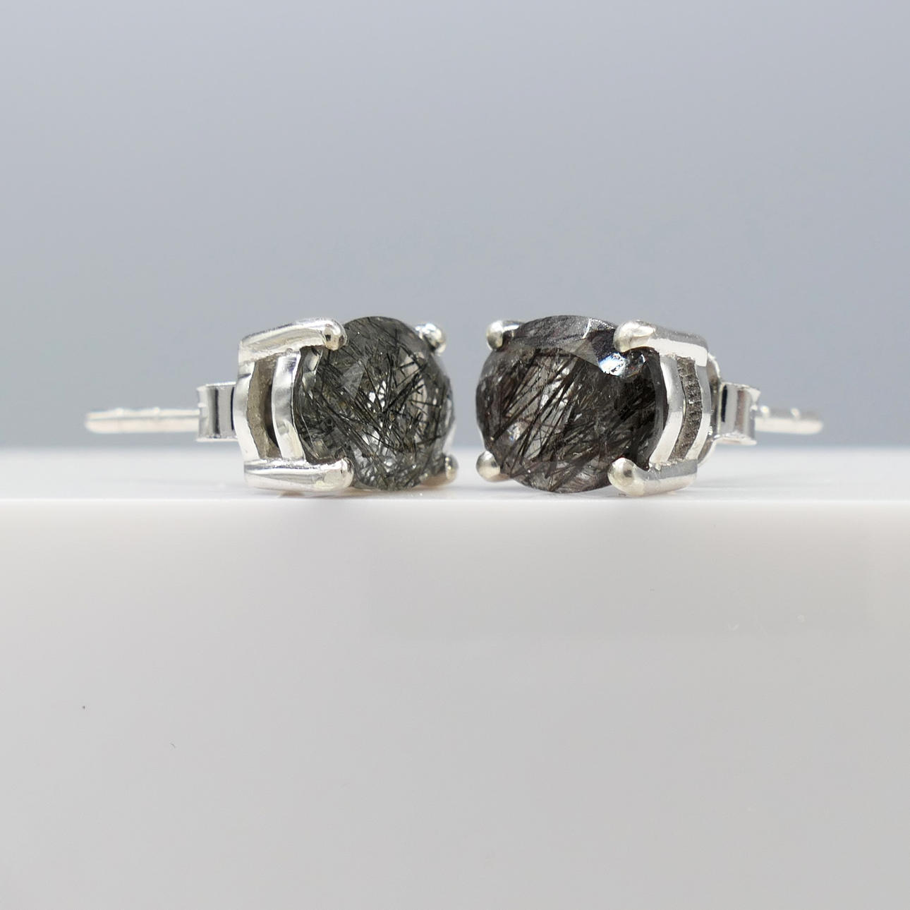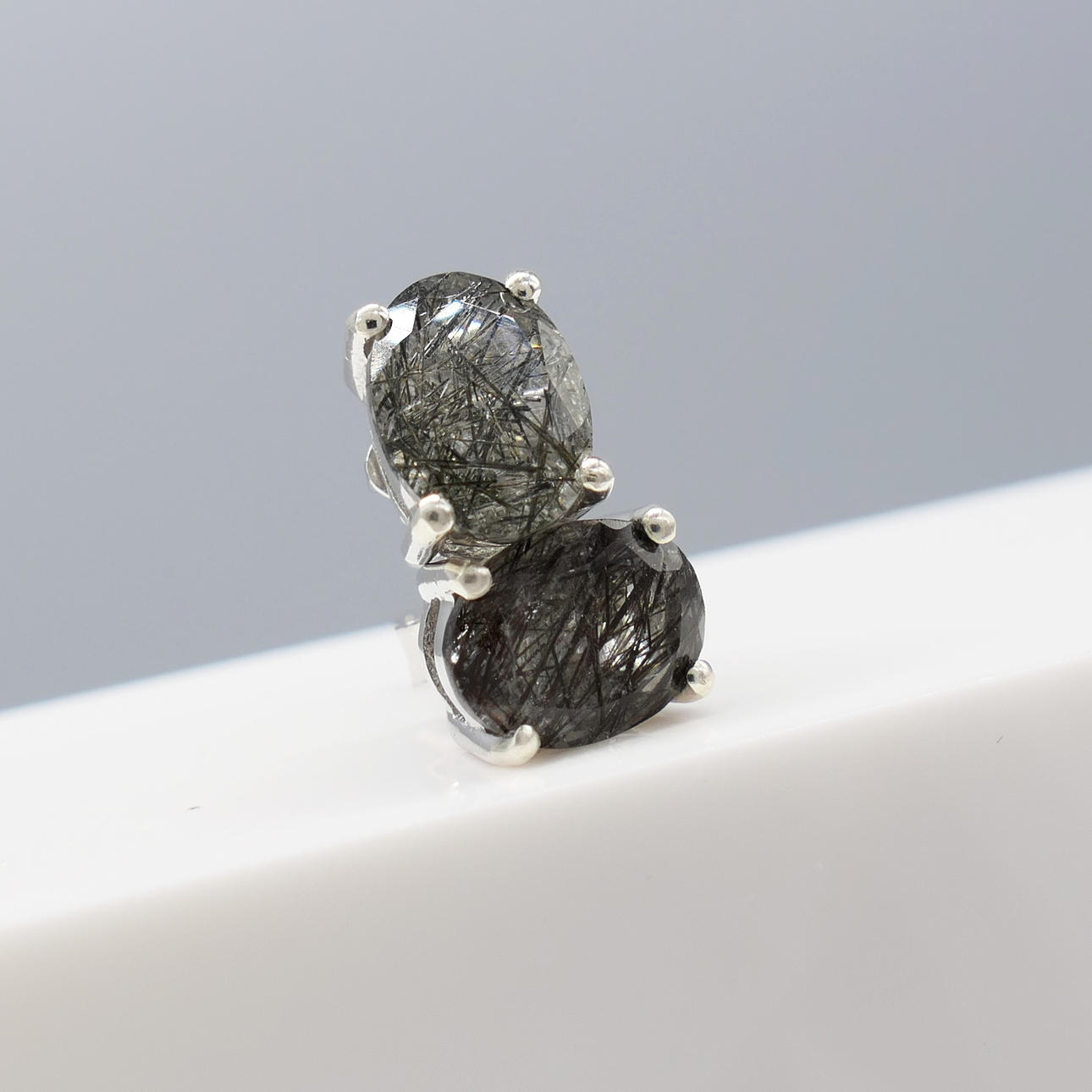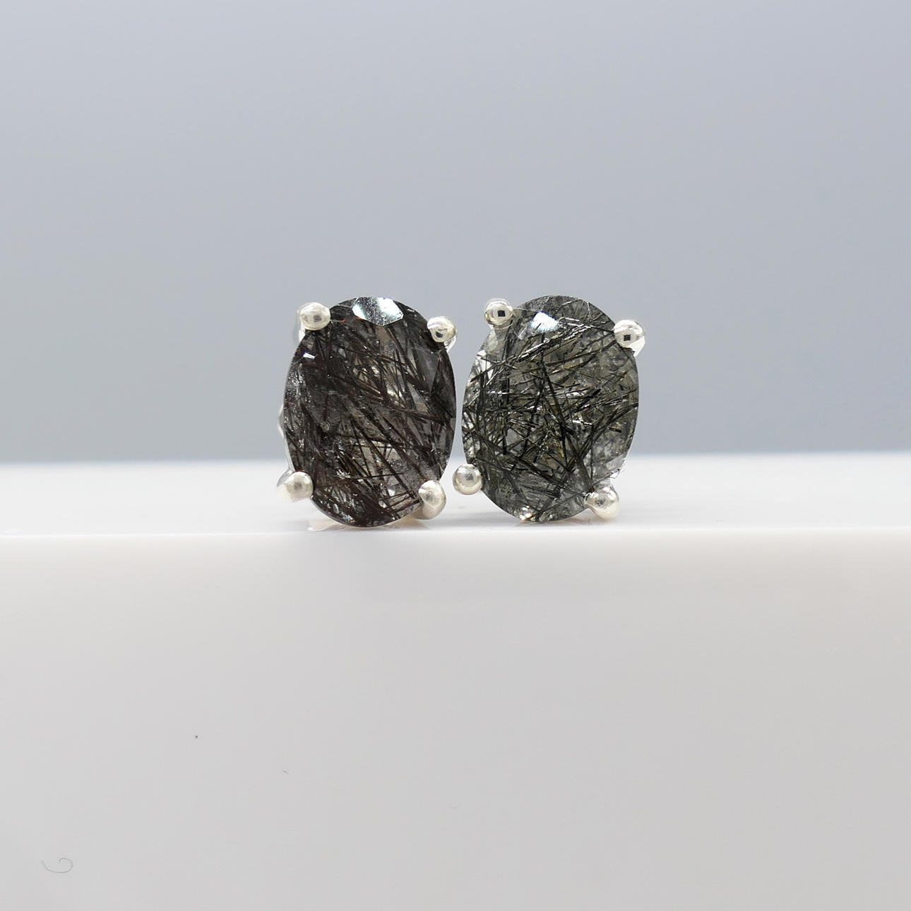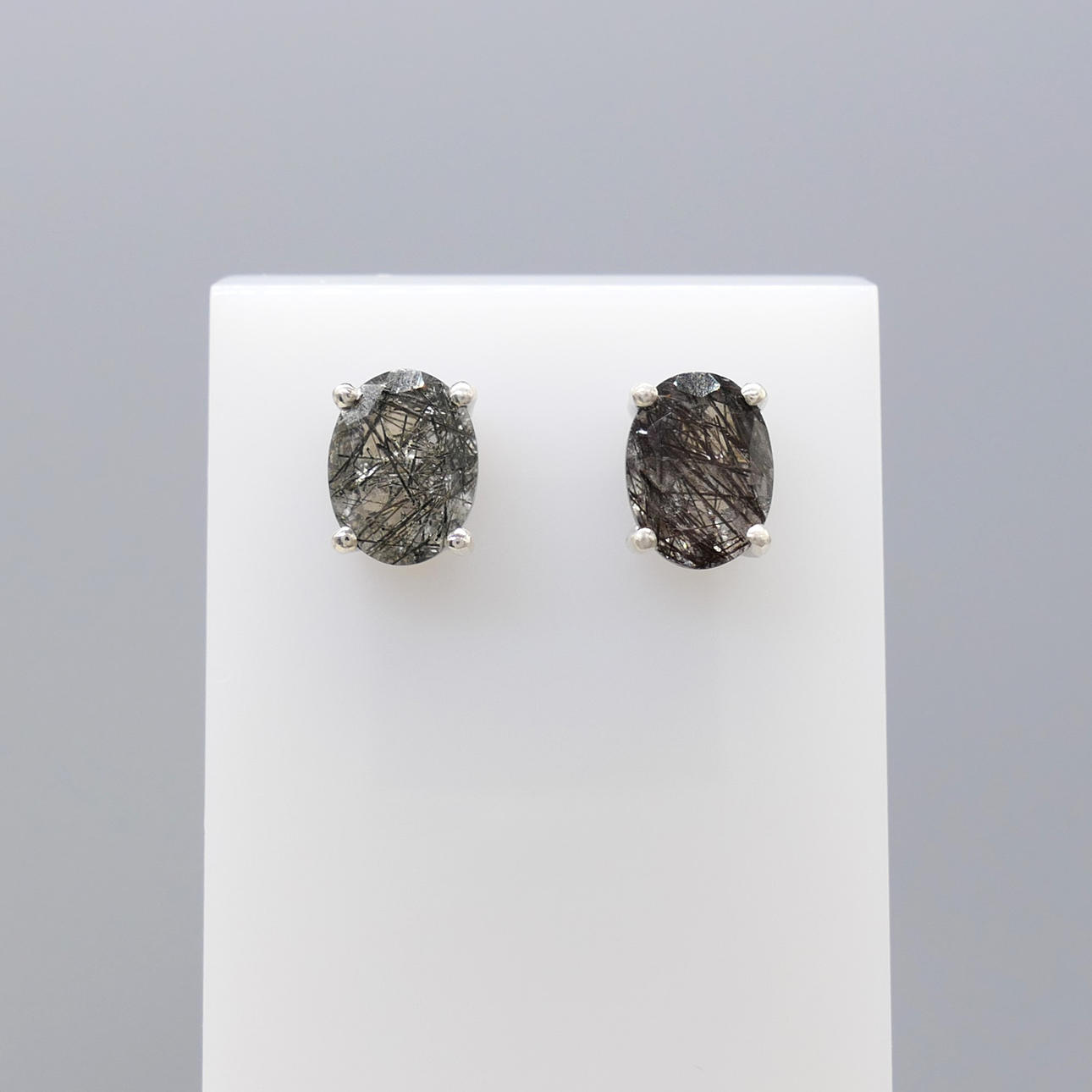 Gemstones: natural rutilated quartz; 2 x oval-cut; 1.50ct total approx; 8 x 6mm each; naturally-occurring black acicular inclusions
