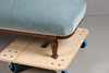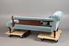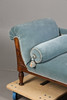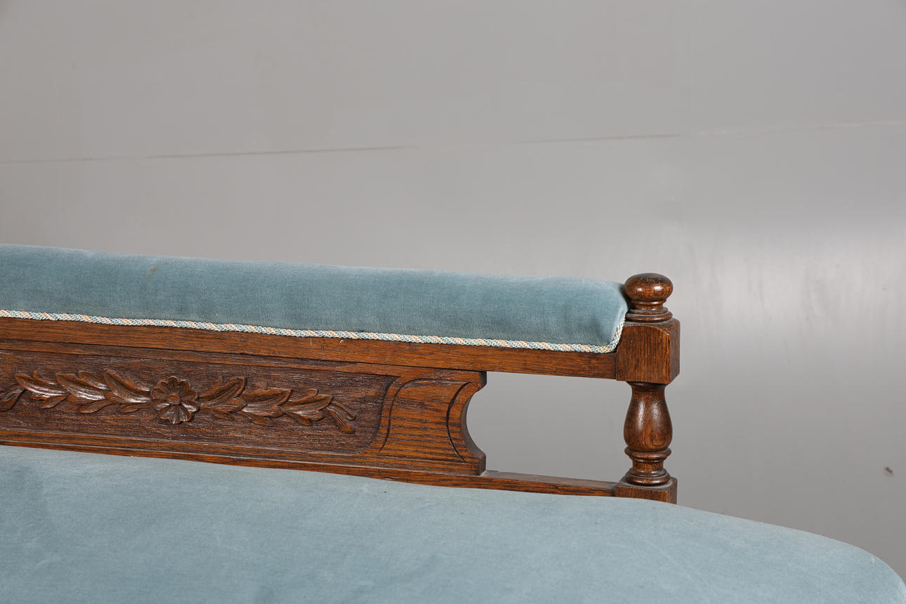 Having blue stuff over upholstery and carved back rail with floral motif, scroll end and raised on baluster legs, approx. 163cm long, 64cm deep, 66cm high.