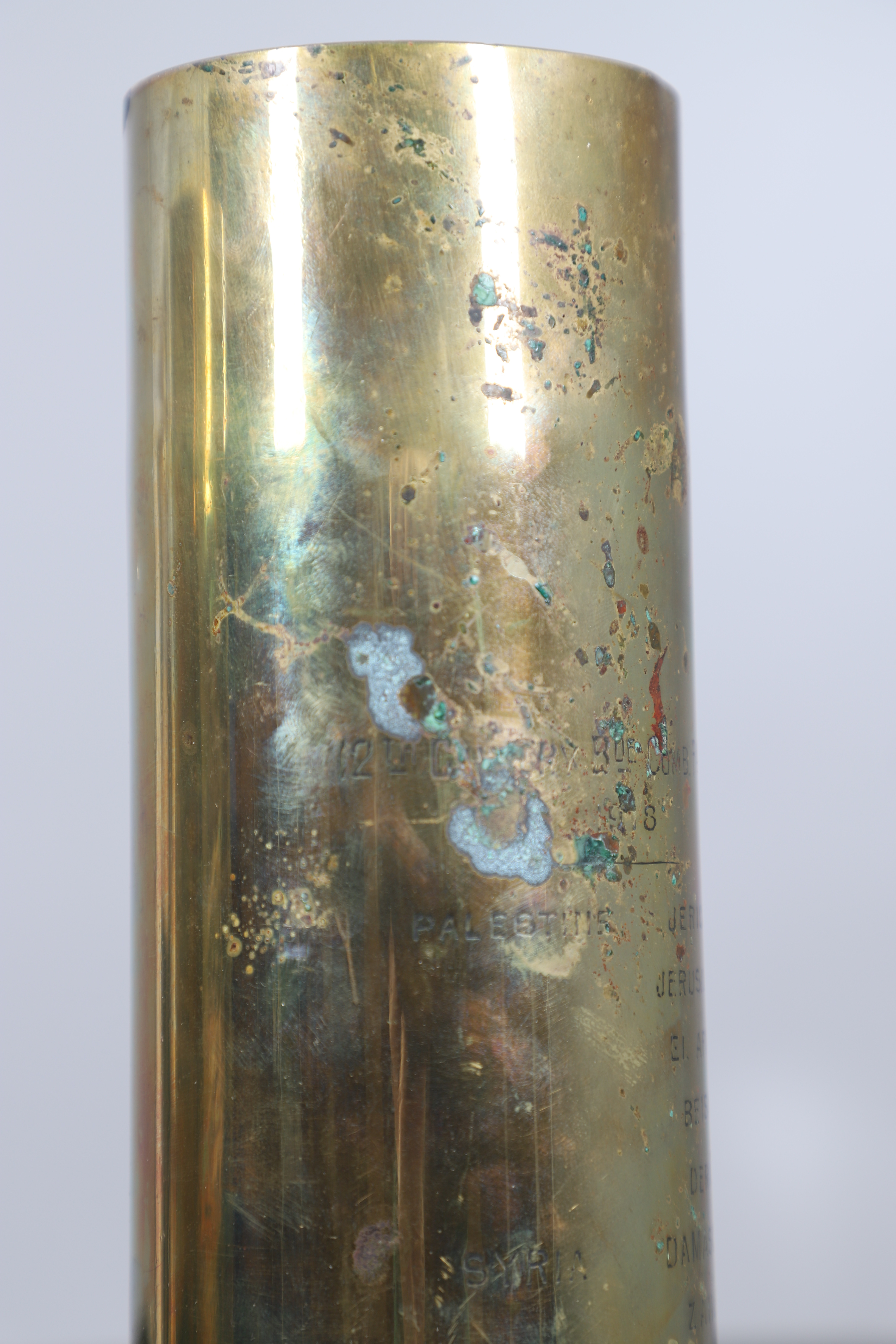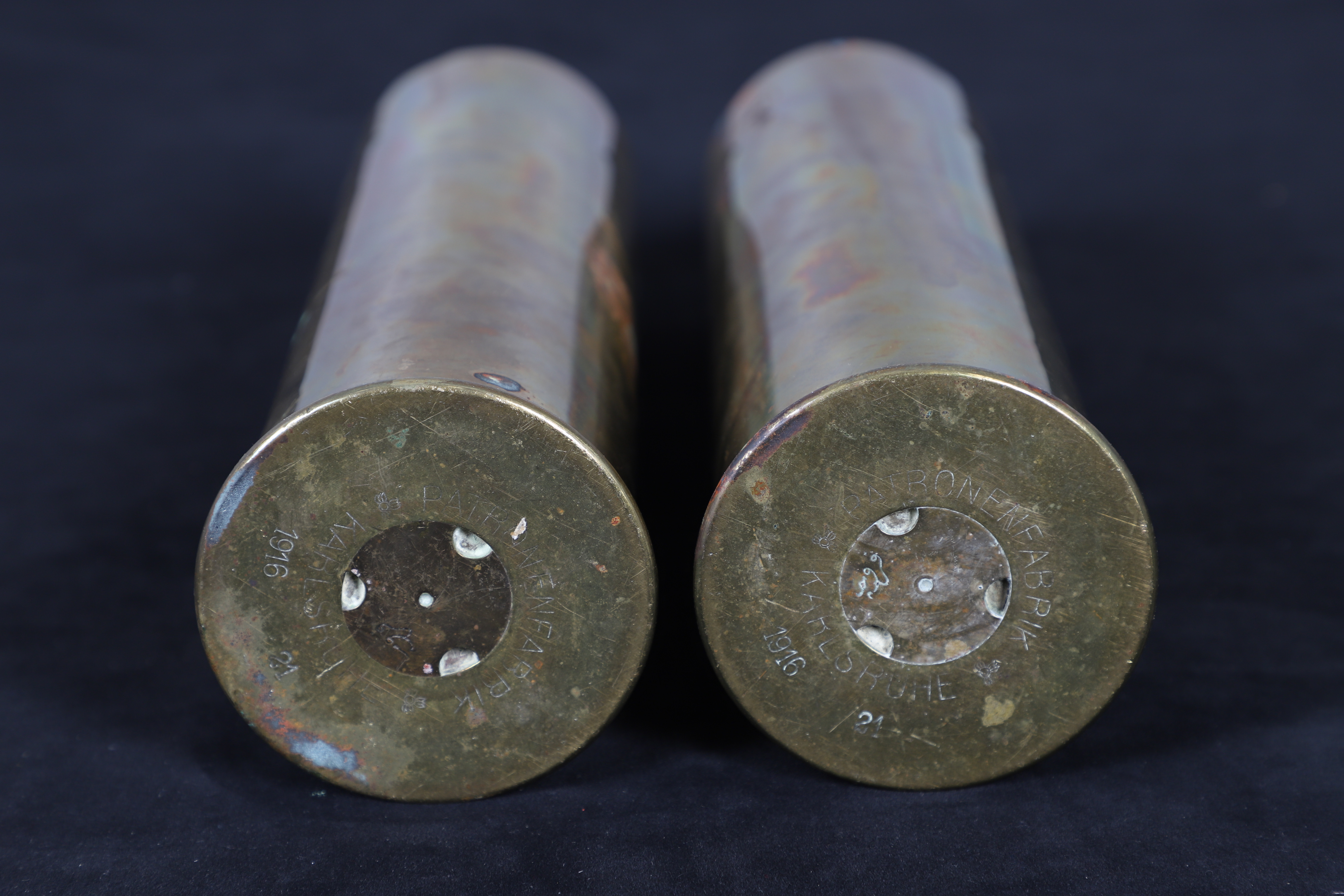 532. 4597355. AN INTERESTING PAIR OF FIRST WORLD WAR SHELL CASINGS ENGRAVED WITH THE RECORDS OF FIELD AMBULANCES.