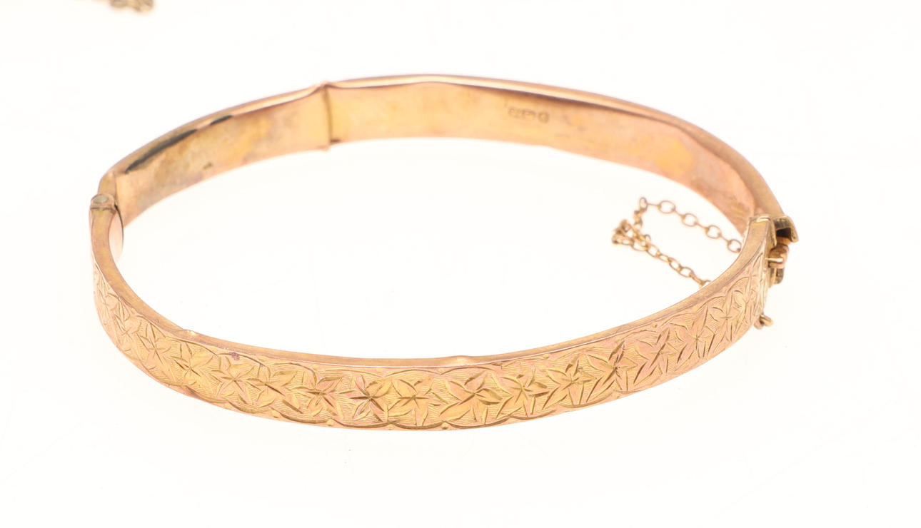 two vintage 9ct gold wristwatches, one on 9ct gold bracelet, a 9ct gold childs bangle 4.4g, and a 9ct gold and diamond initial P bracelet slide on silk band.