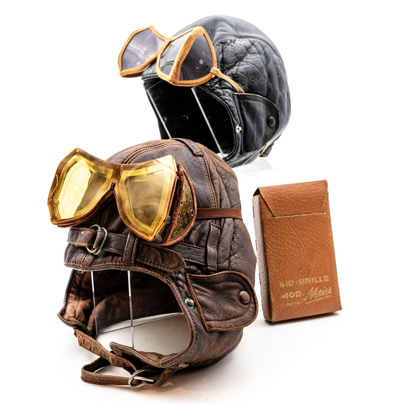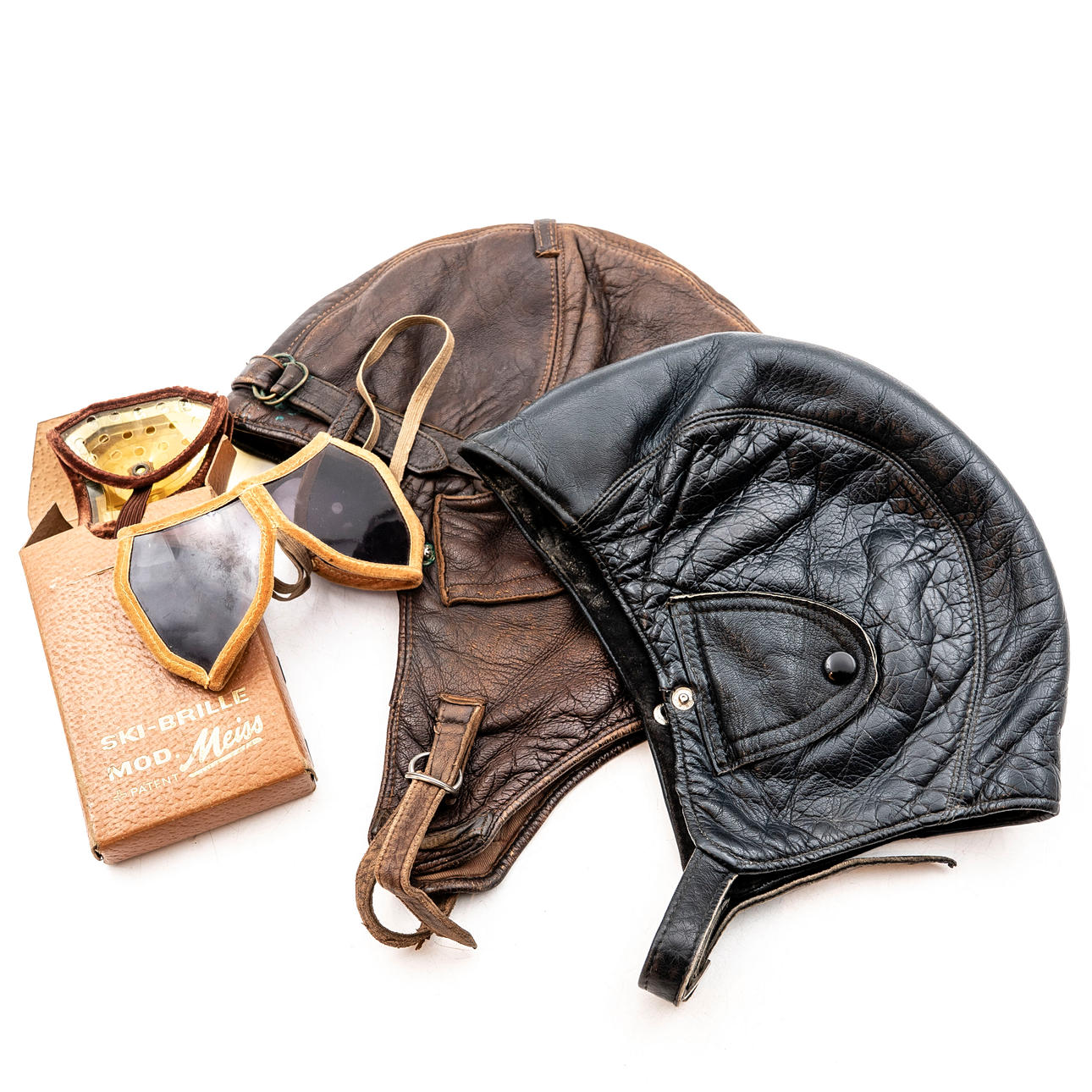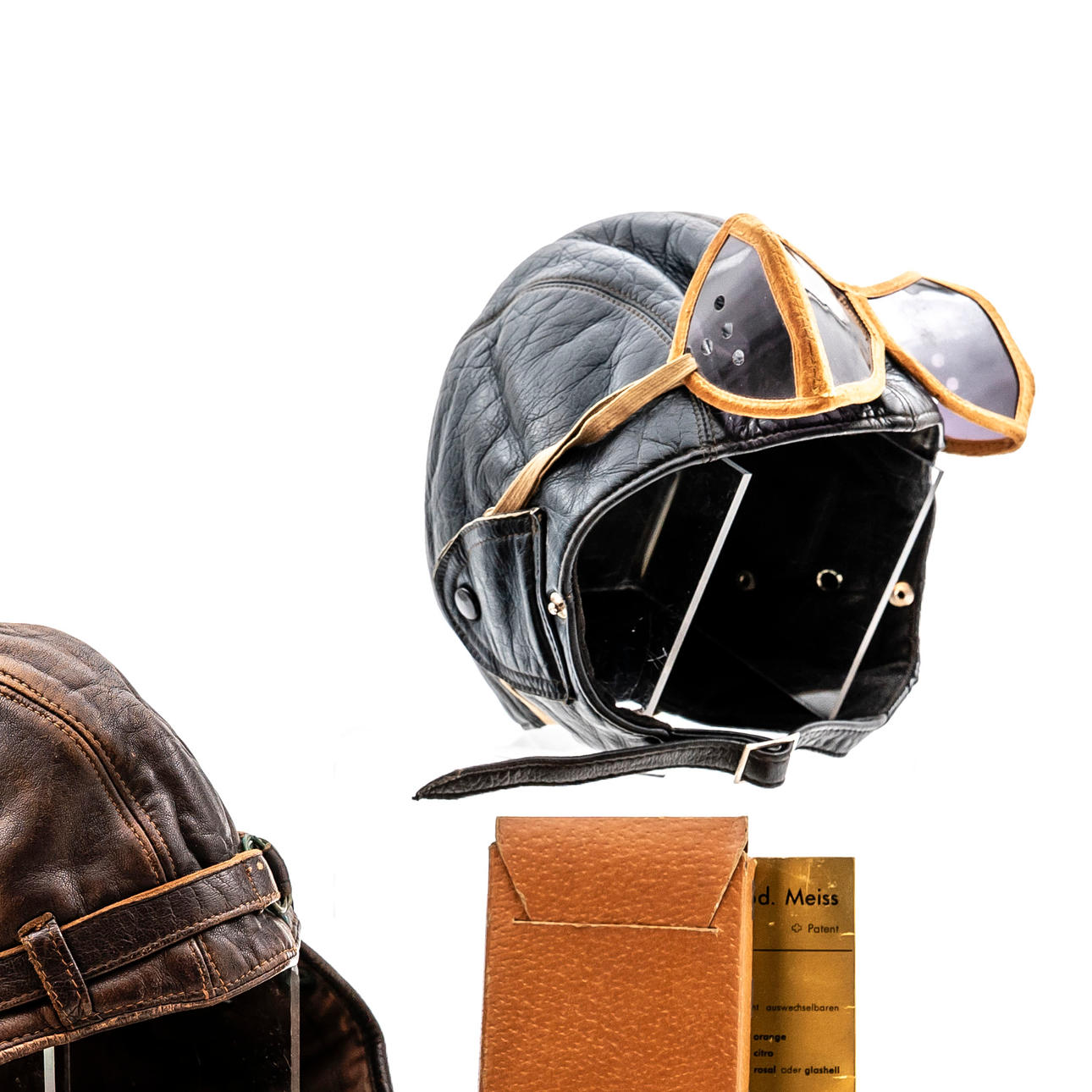 Motorcycle caps and glasses, 4 pieces, 20th century.