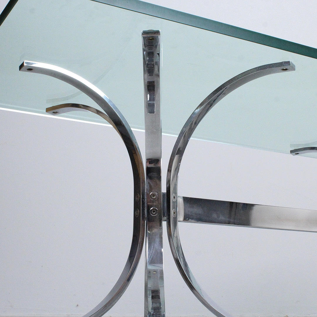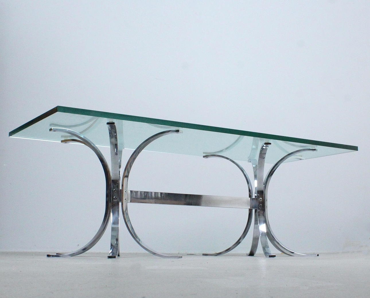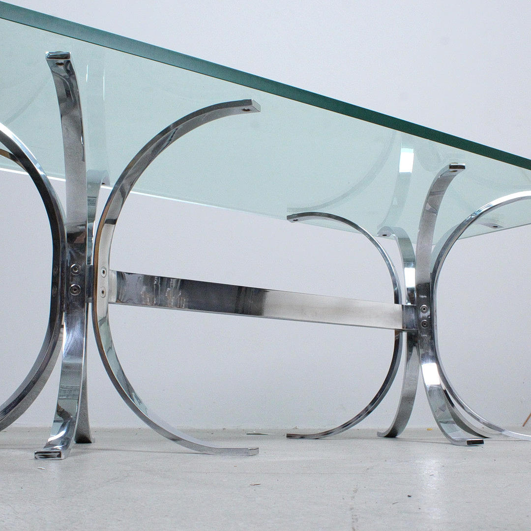 Coffee table/coffee table, steel, glass, 1970s, chrome-plated steel frame, rectangular glass table top, dimensions approx.: h. 51.5 cm, W 145.5 cm, depth 60 cm, thickness of the plate 2.5 cm.