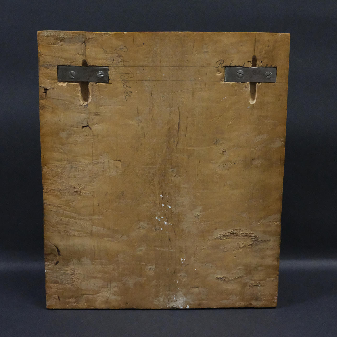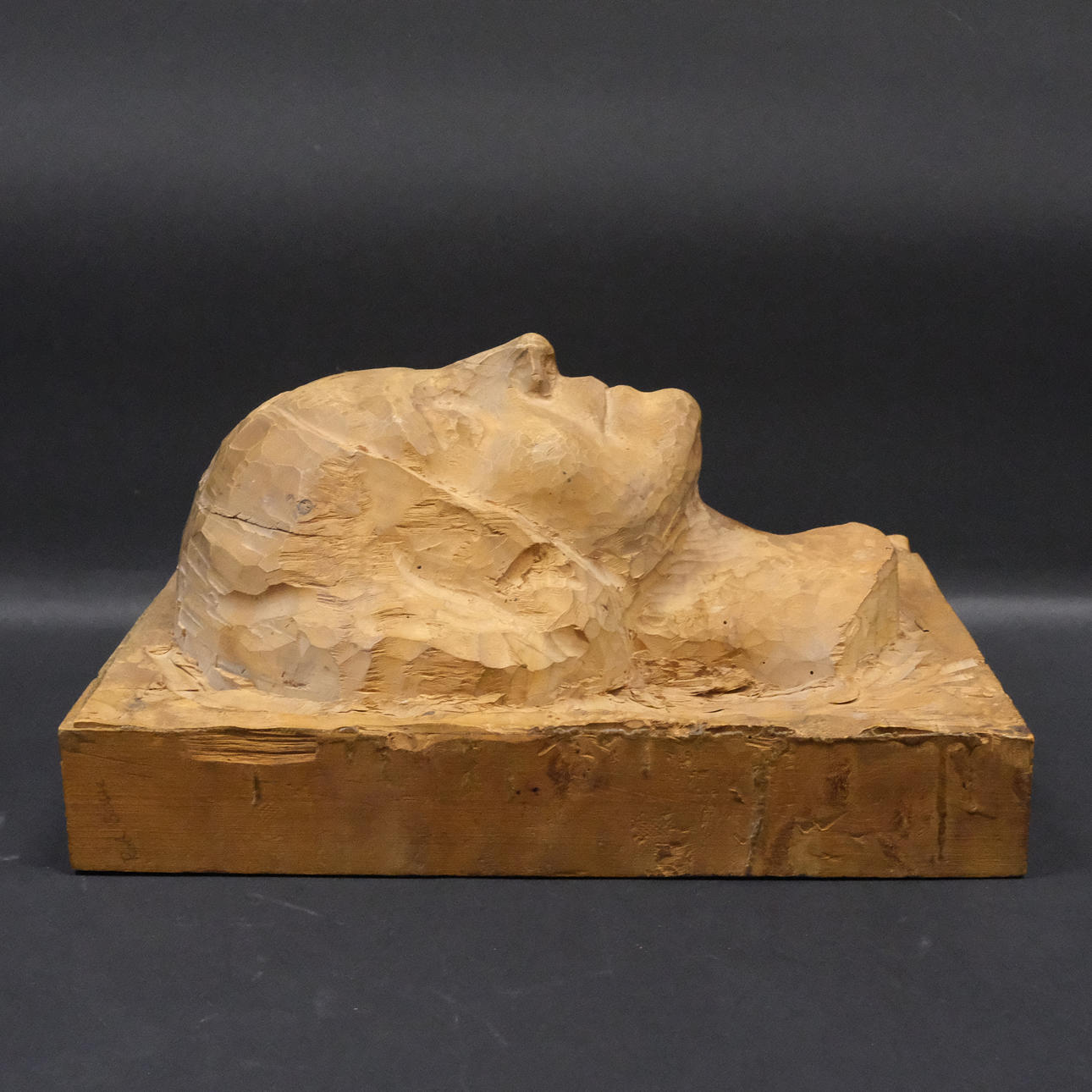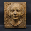 Wooden block with cut out woman's head, unidetified artist, dimensions 30 x 36 cm, back marked Rob Besse.