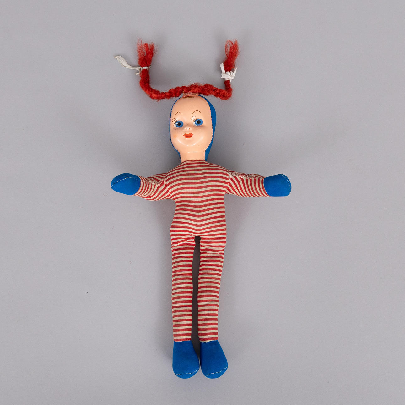 Upholstered doll textile with plastic face. Length: 41 cm.