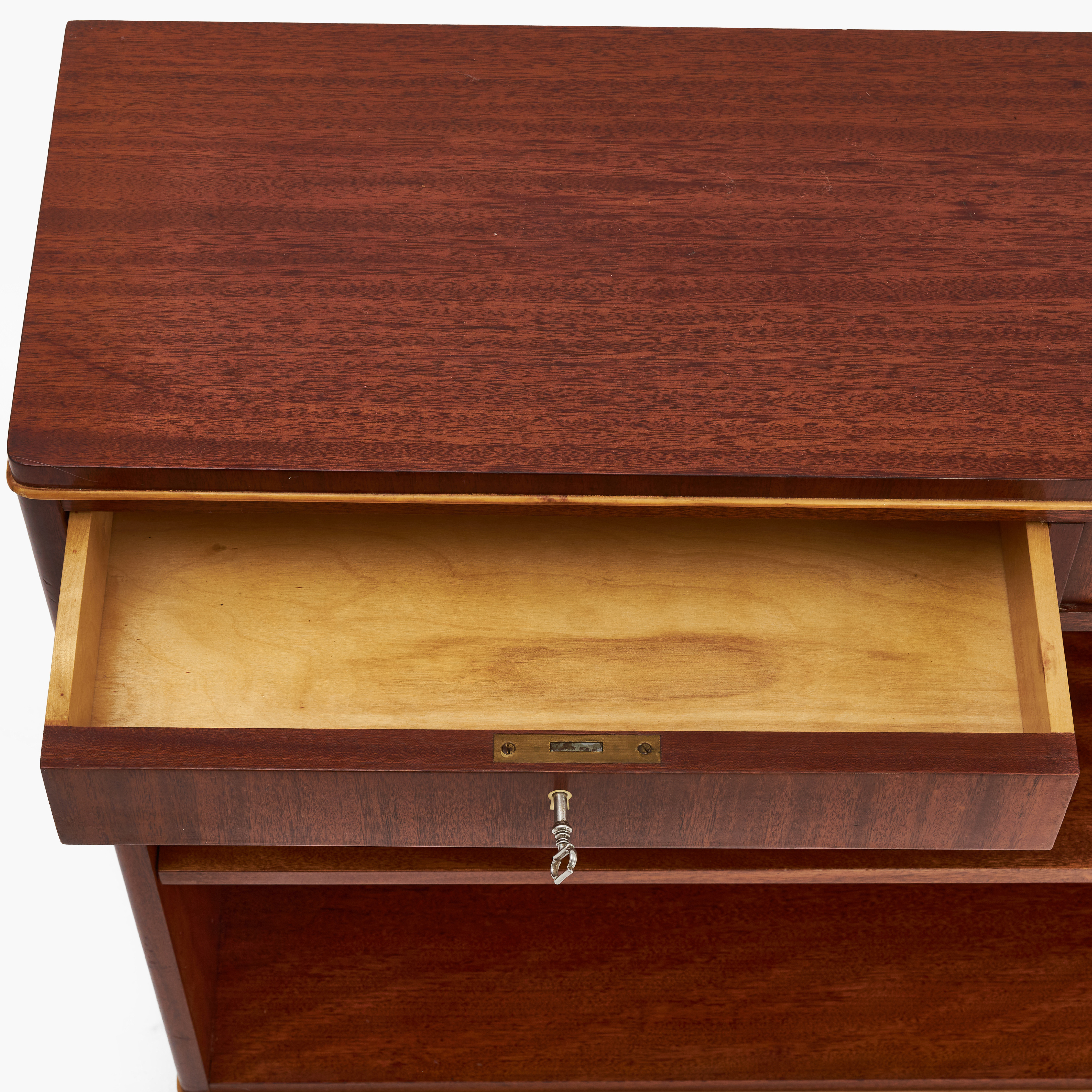 4613336. A shelf, with drawers and side cabinets, 1940s, Swedish Modern, veneered in mahogany with light hardwood moldings.