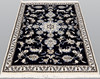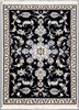The carpet has a dark blue base color with a detailed floral pattern in light tones of beige, ivory white and light blue. The center field is adorned by a symmetrical medallion motif surrounded by winding flower vines. The bangs are wool and the warp is cotton.