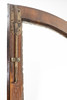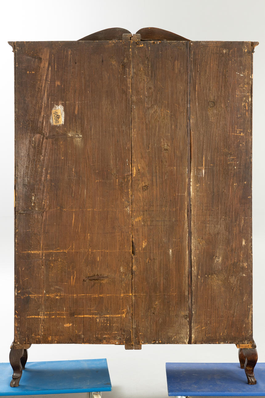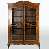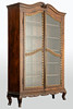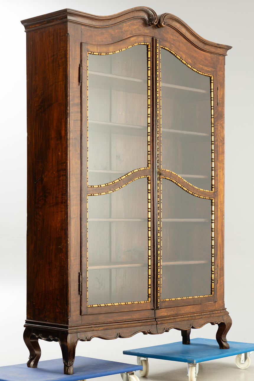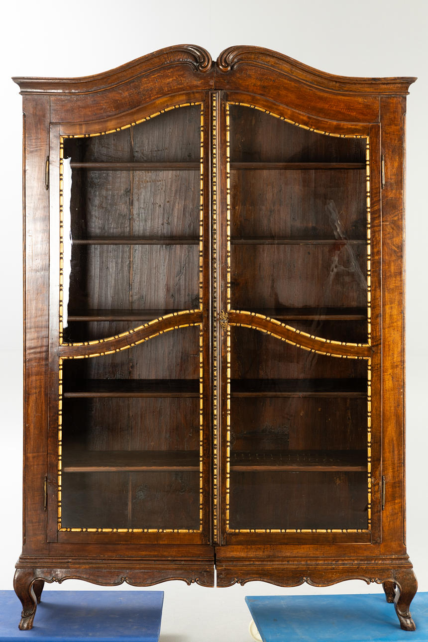 18./19. Jh. Walnut, gilded moldings. Rectangular body with rounded corners on a passively curved frame and curved feet. Front divided by two display doors. Narrow, curly rising cornice made of volutes placed against each other. wooden shelves. 1 key available.