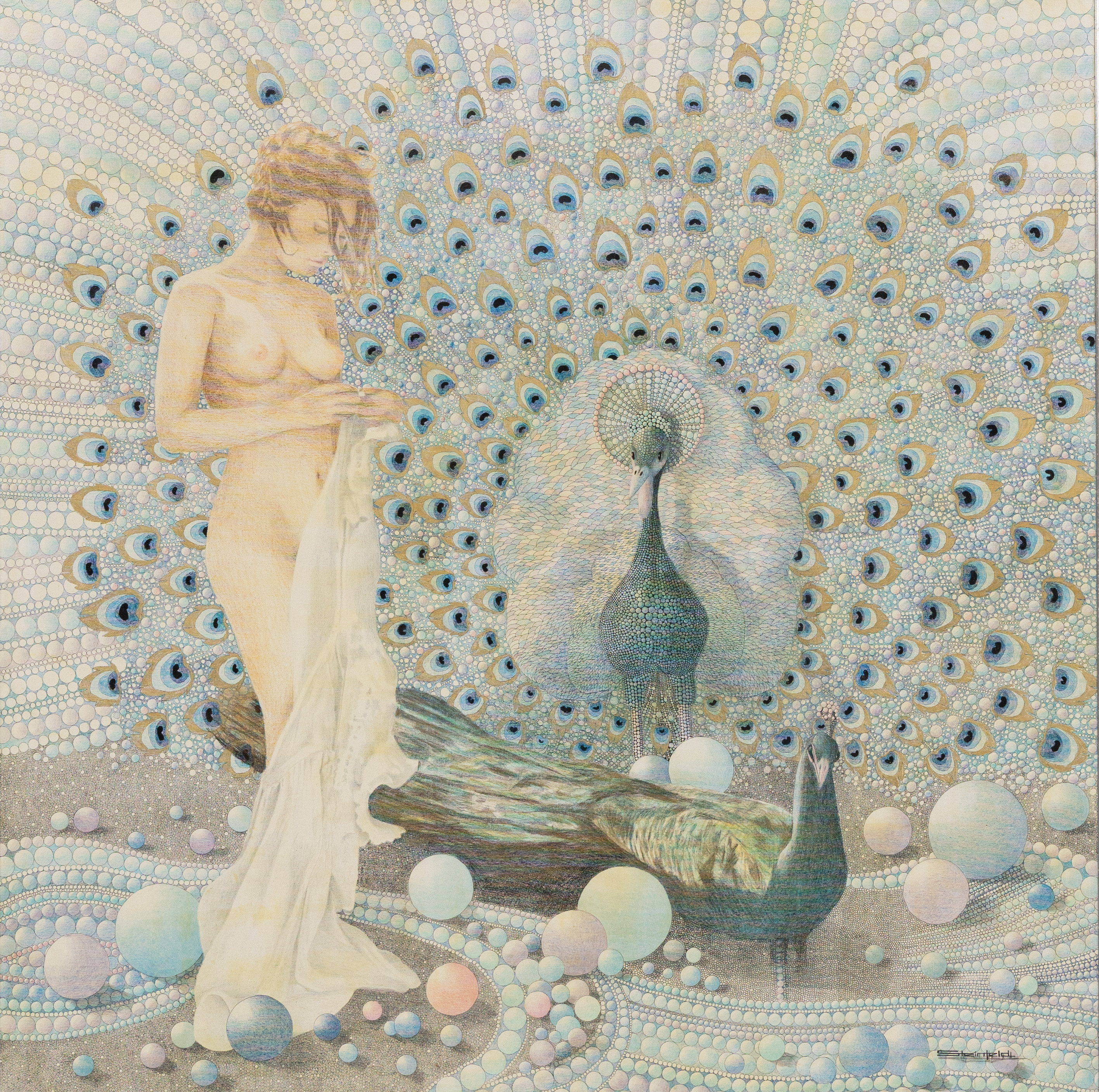 4622869. SIGMAR STEINFELD. Woman and peacock, mixed media, signed on verso.