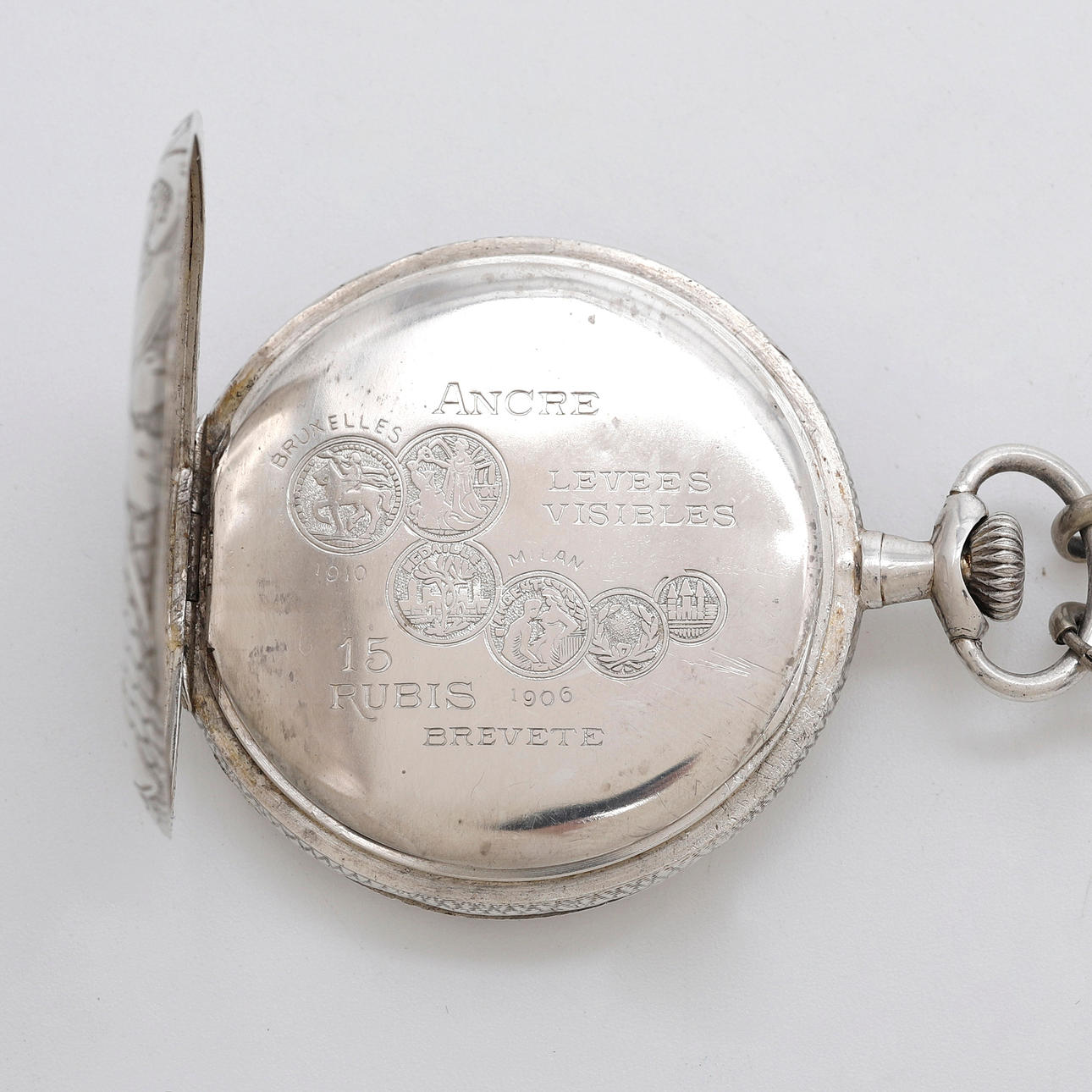 Silver case with 3 lids of 49 mm diam. Silver dial with micro-seconds dial at six o'clock. Machine with anchor exhaust. Manual winding movement. Including a metal chain. Weight 75.2 gr.