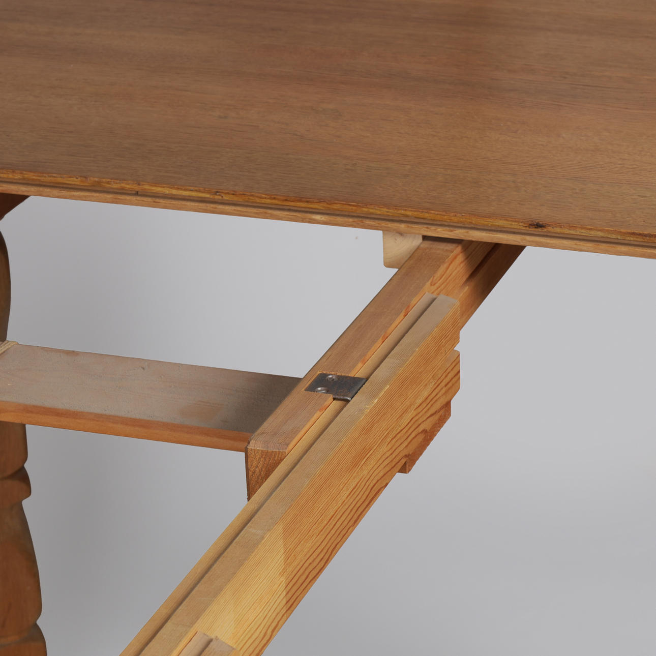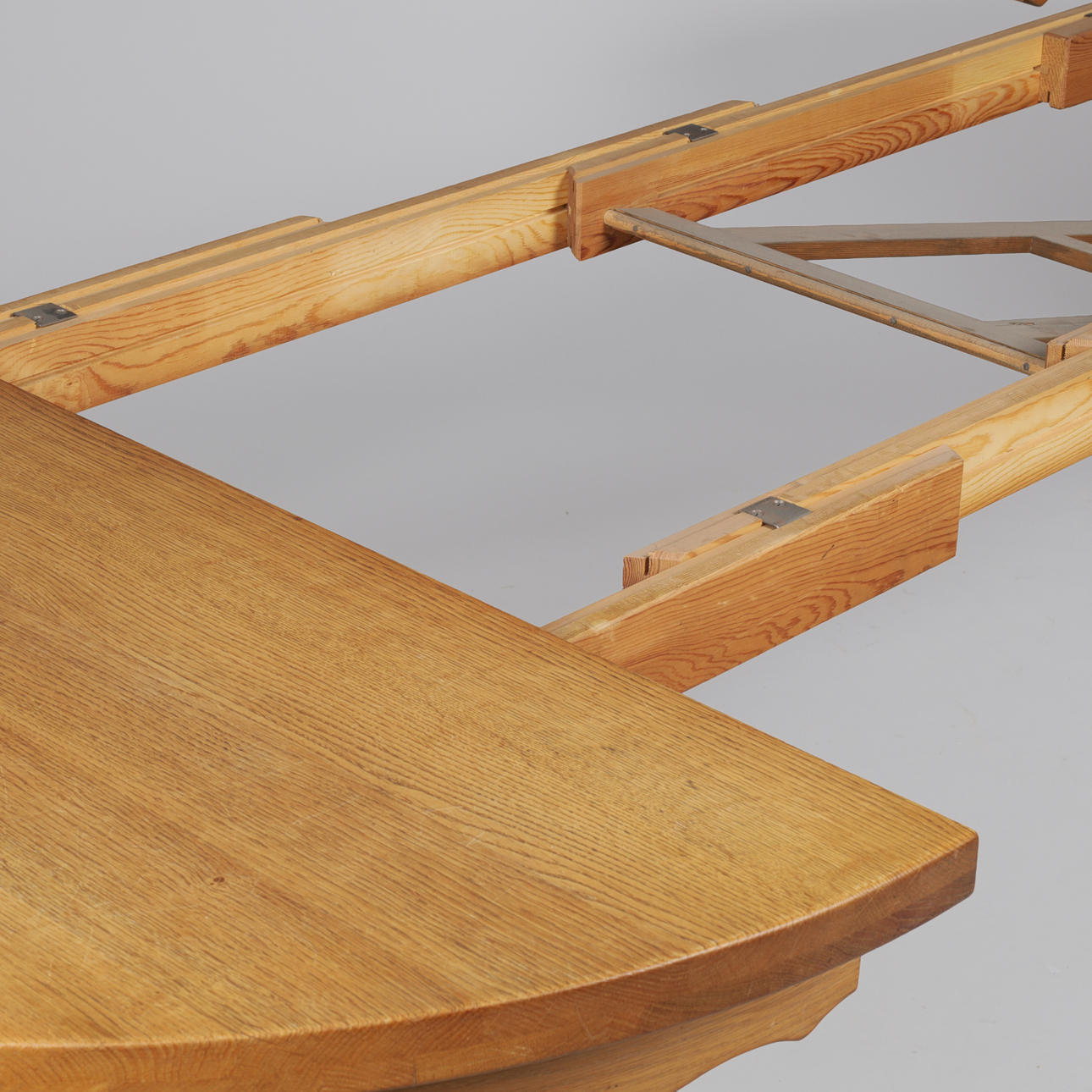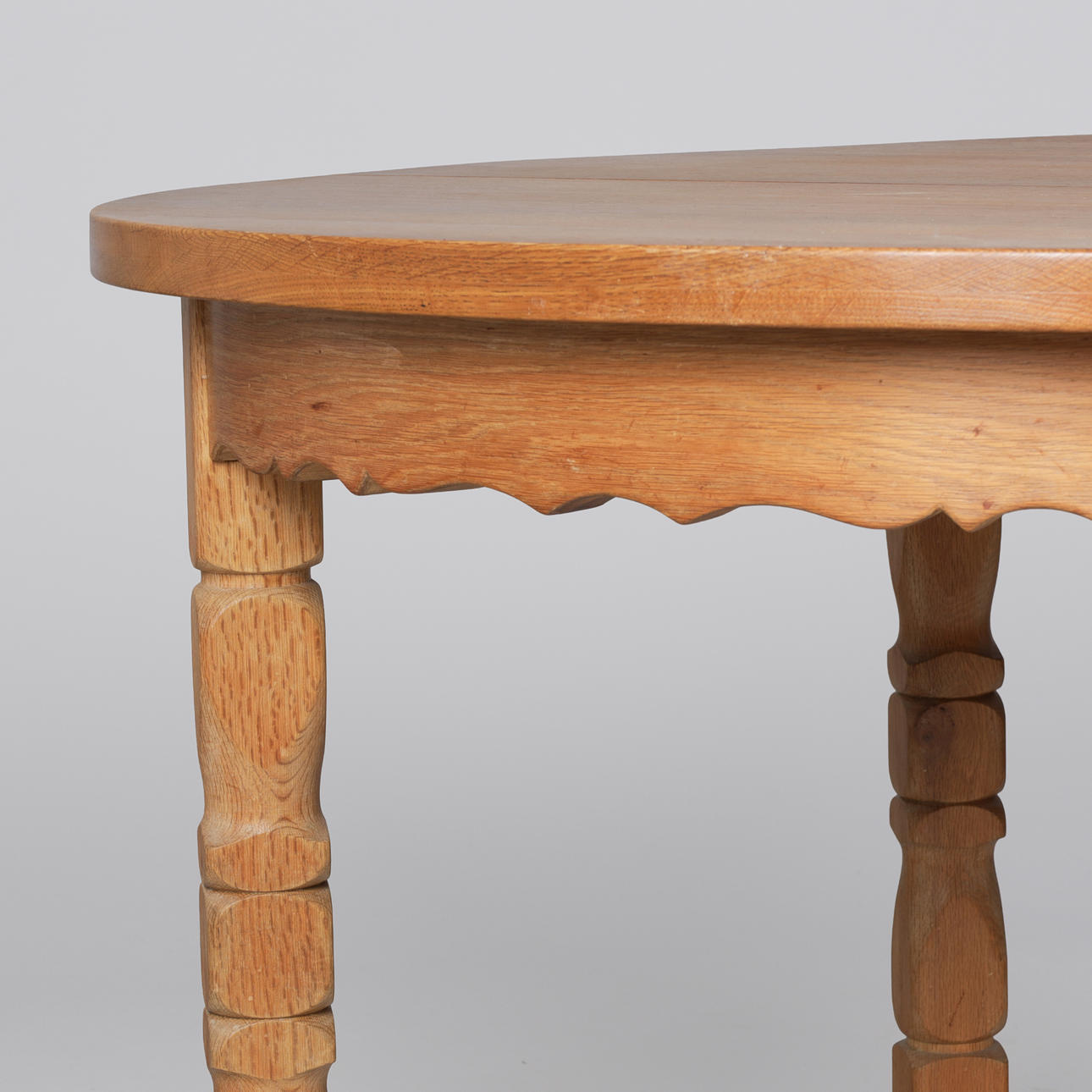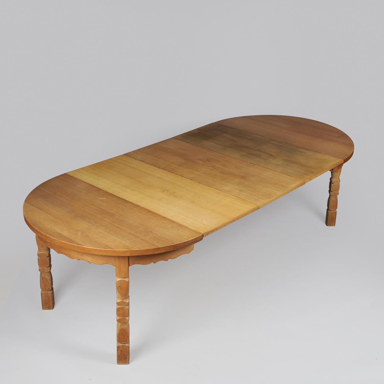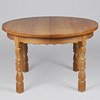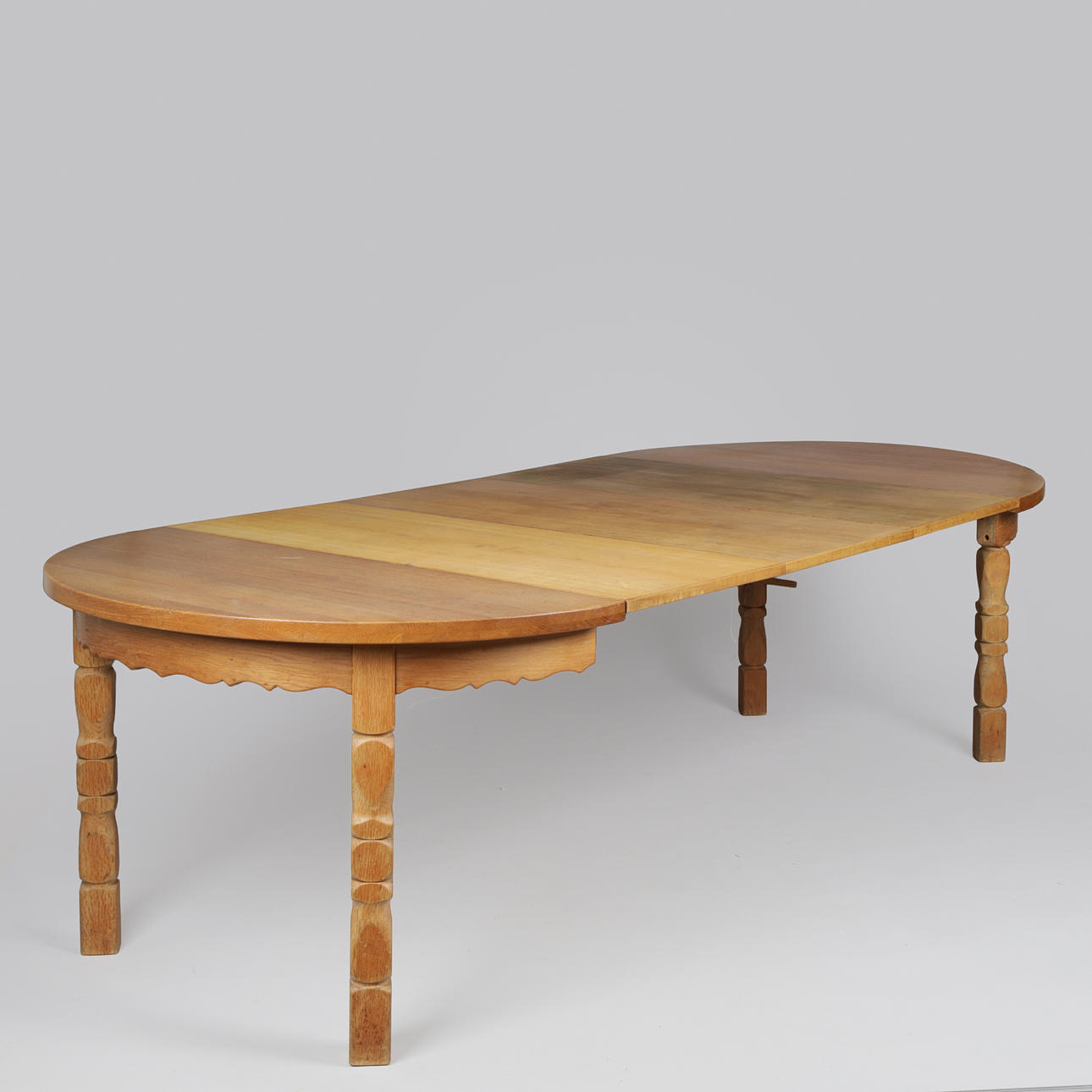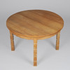 4627976. Circular dining table made of solid oak with pull-out and additional plates, Kjærnulf style, Danish furniture manufacturer, Denmark, second half of the 20th century (1+3).