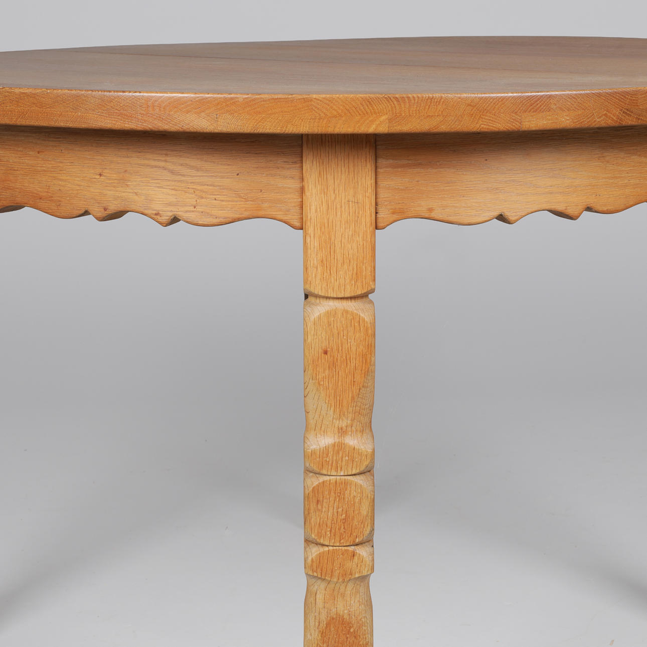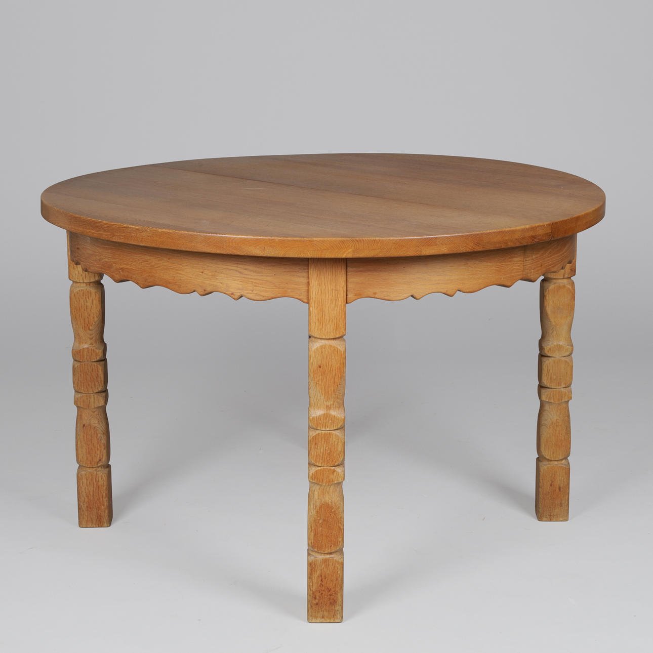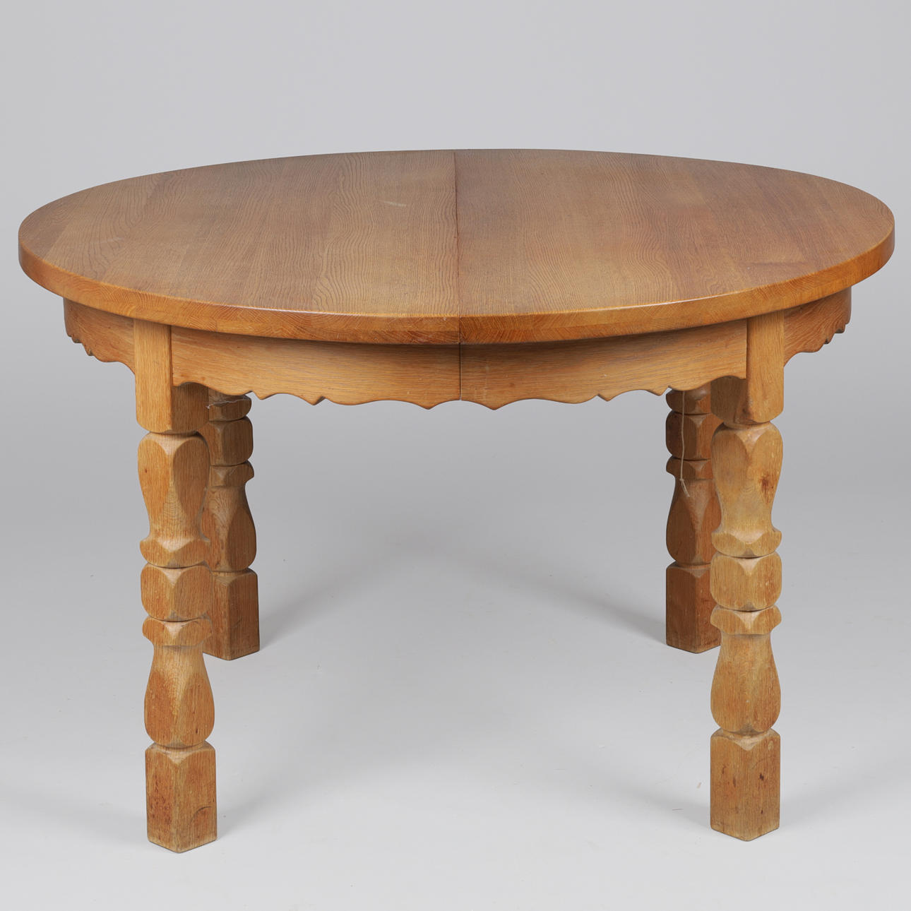 Circular dining table made of solid oak with turned legs and sarg with relief. The table has pull-out and three additional plates. Manufactured by a Danish furniture manufacturer.