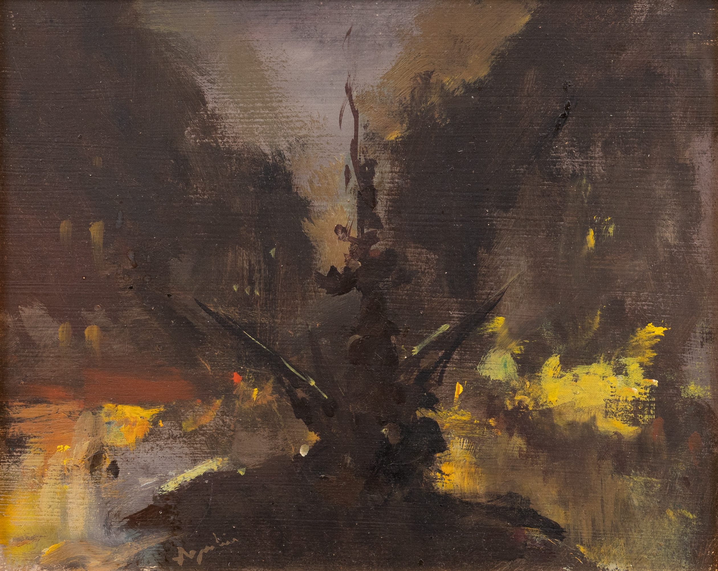4642786. ARNE ASPELIN. Fountain in park setting, oil on panel, signed.