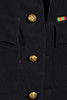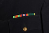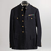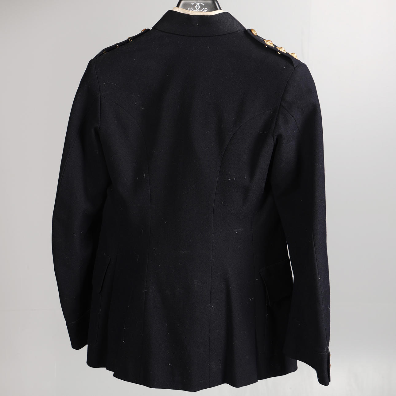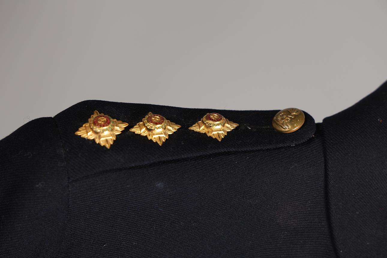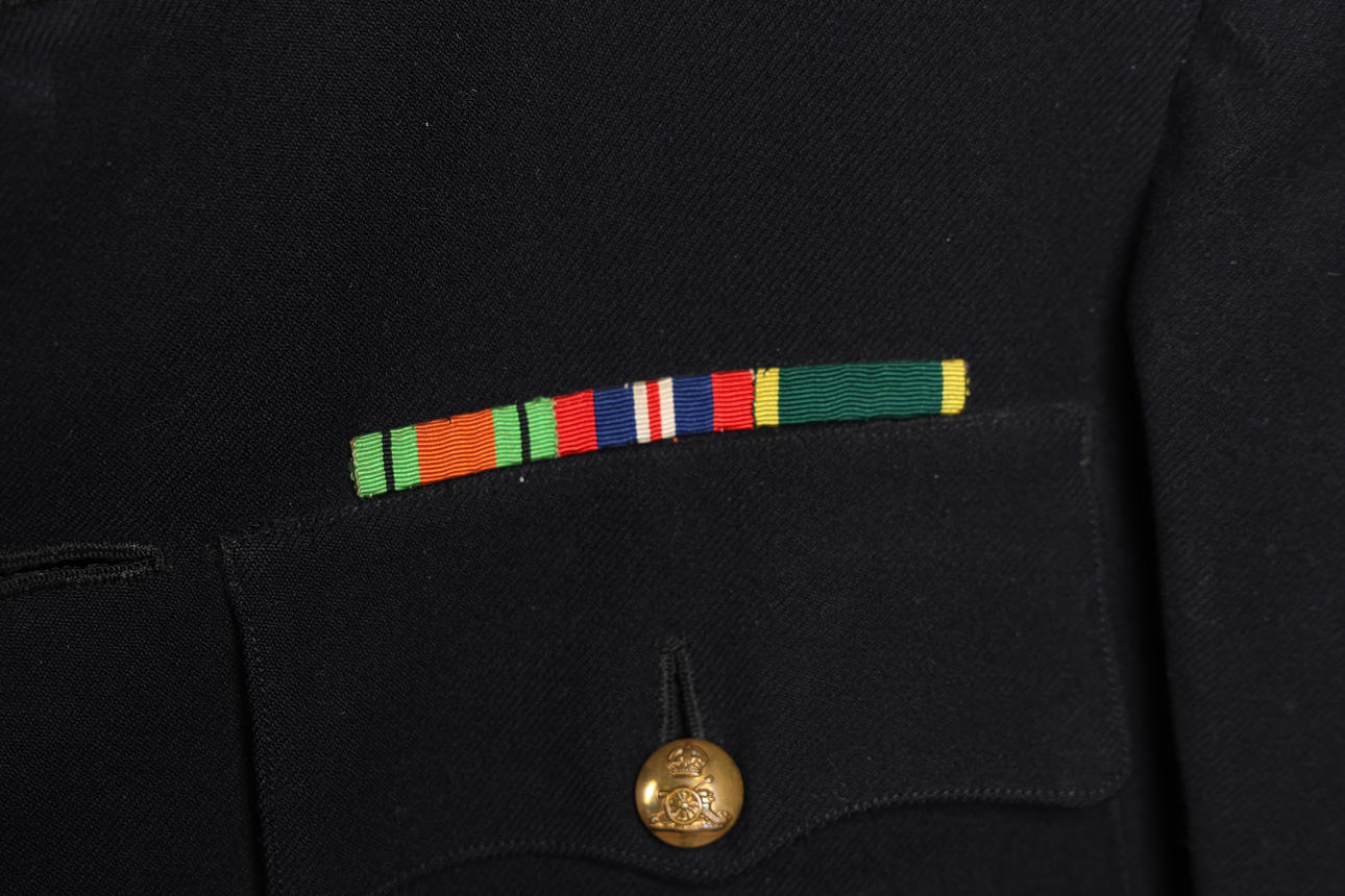 Royal Artillery Officer's No'1 Dress uniform, blue cloth with kings crown buttons throughout, rank insignia ton a captain on epaulettes, medal ribbon bar for the Defence Medal, 1939-1945 British War Medal to left breast, trousers with broad scarlet stripe to welts.
