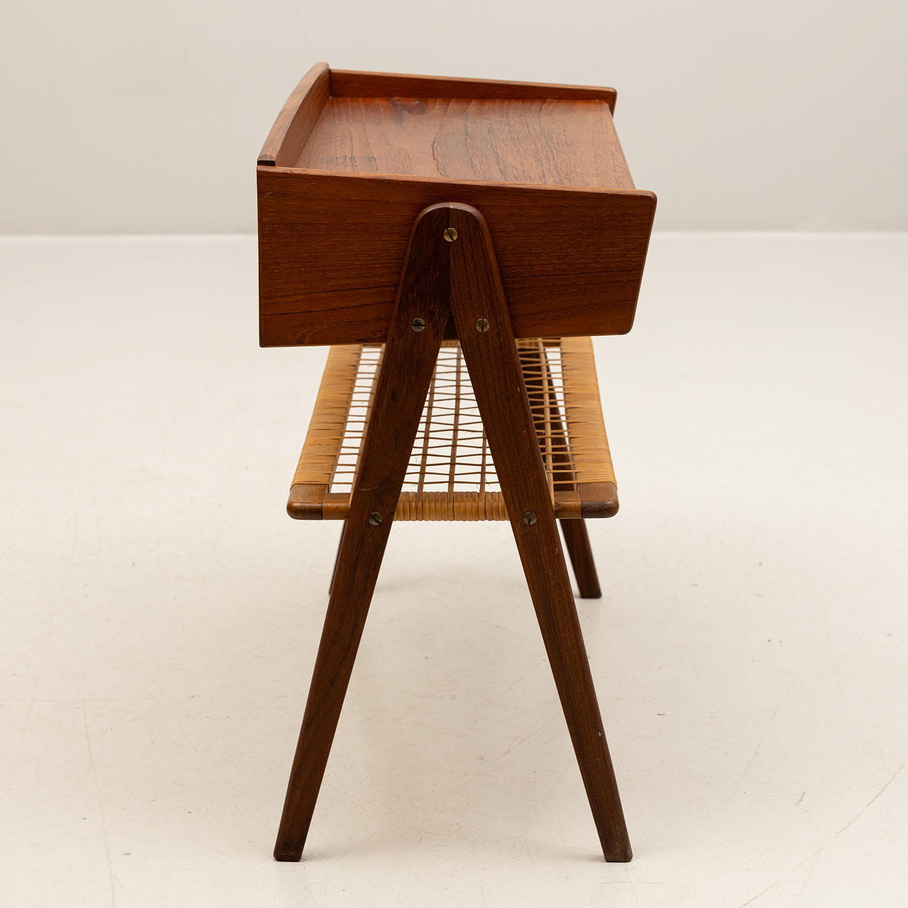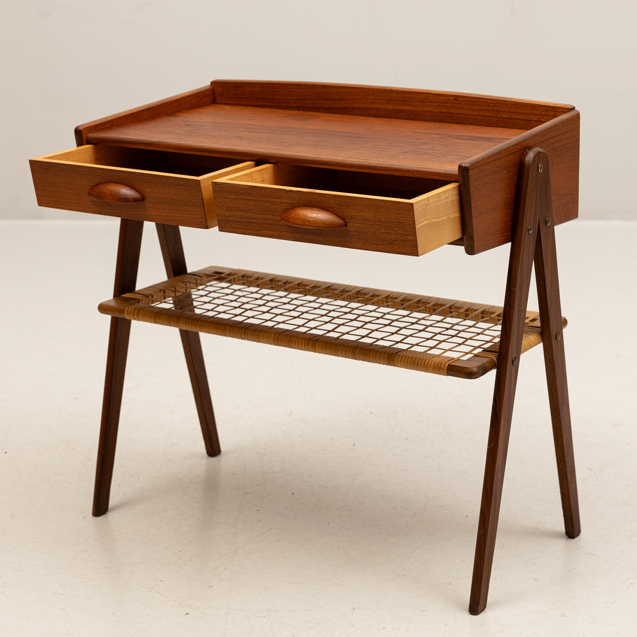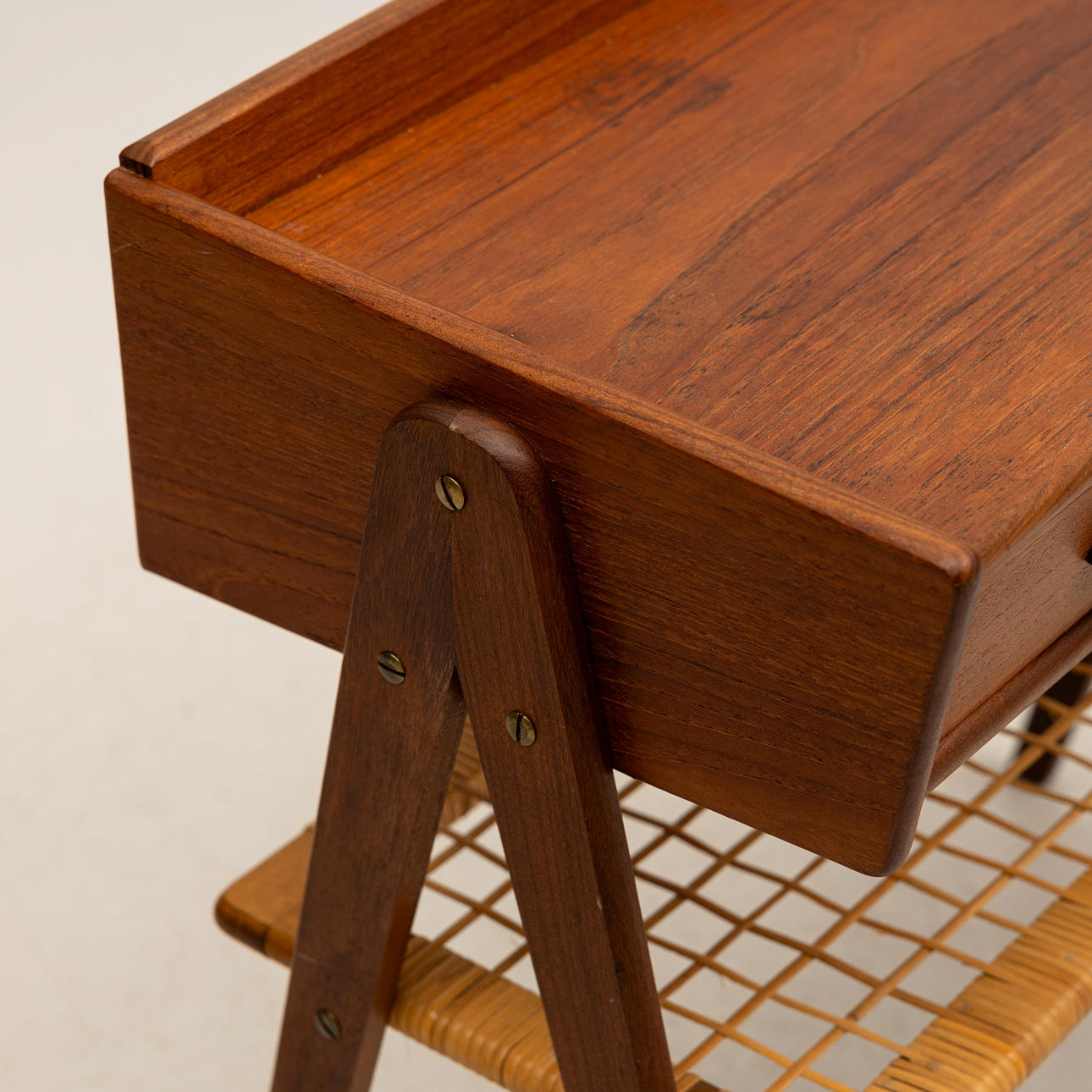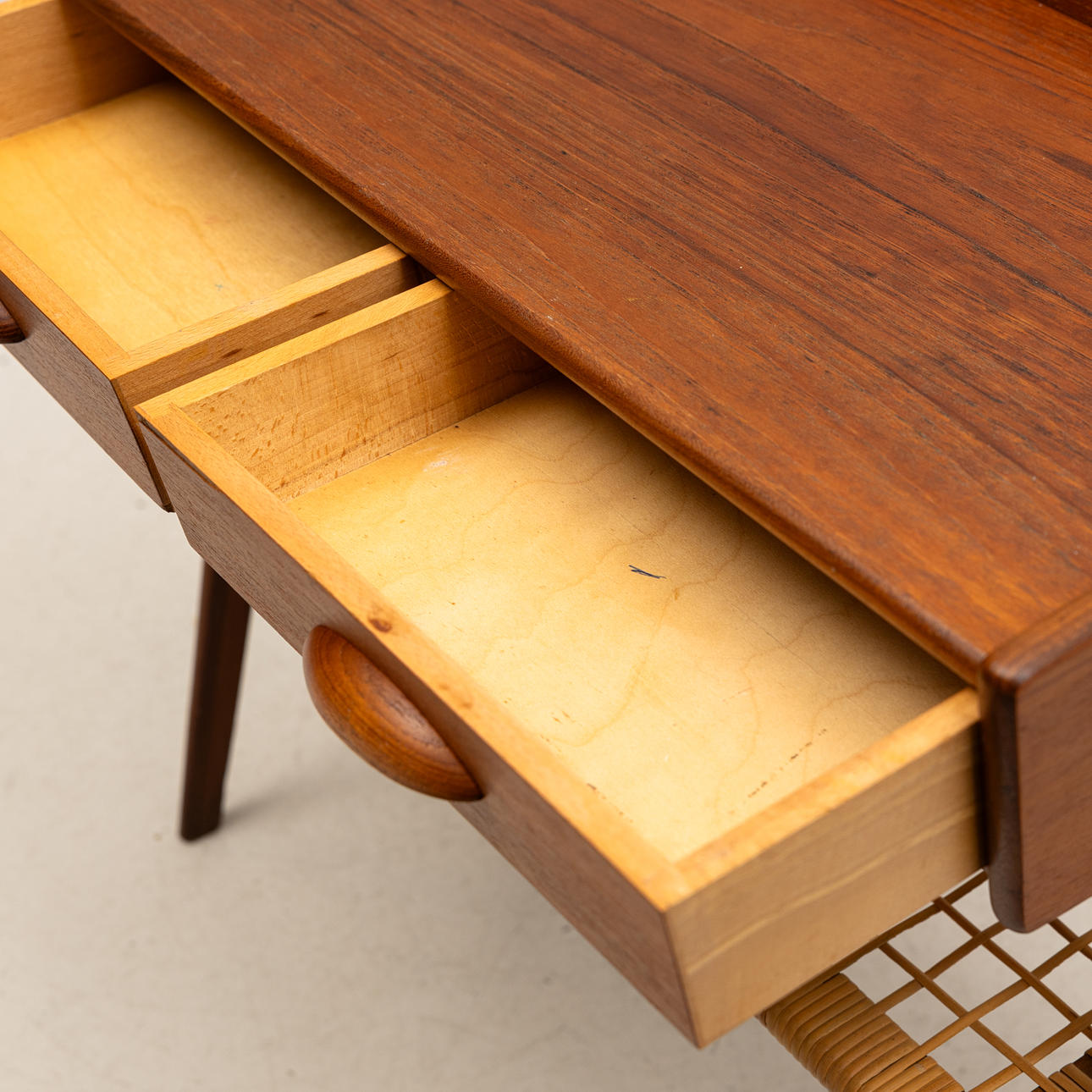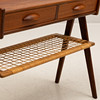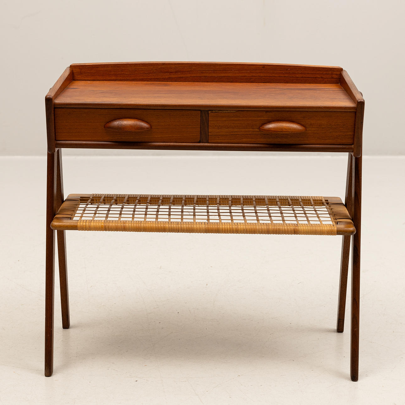 Rectangular shape with 2 drawers, shelf in rattan, length approx. 63, depth 30and height 60 cm.