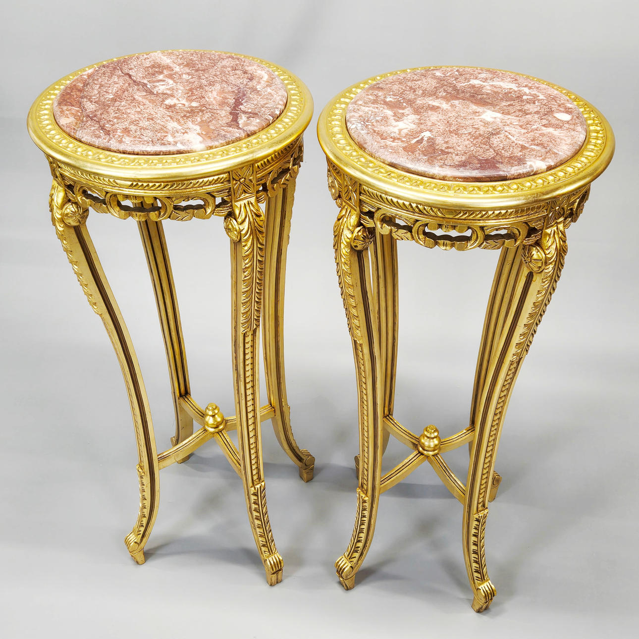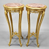 A pair of marble topped gilt wooden stands, H. 110cm, Dia. 49cm.
