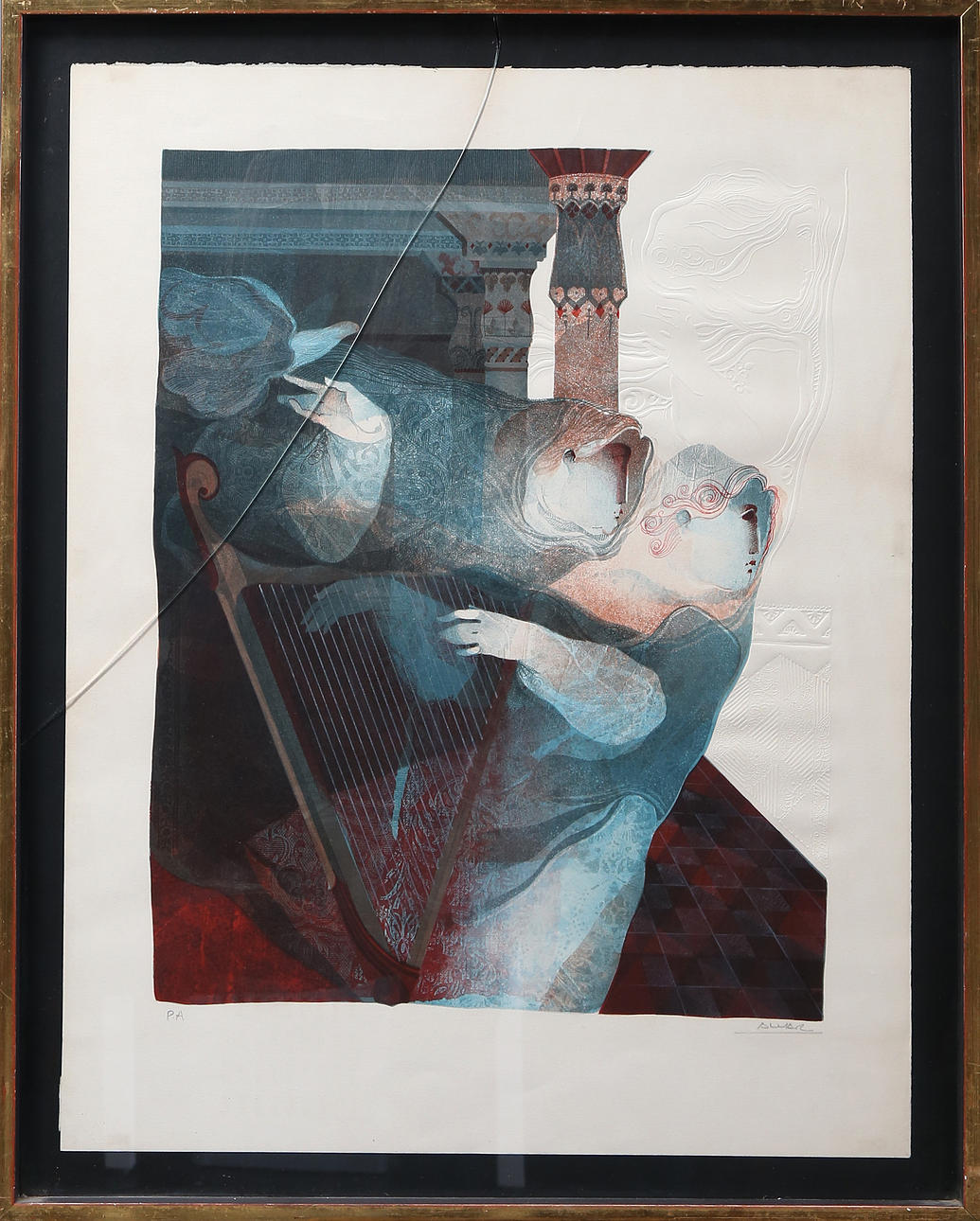 In good condition. The glass has a vertical fissure. It has not been examined out of the frame.