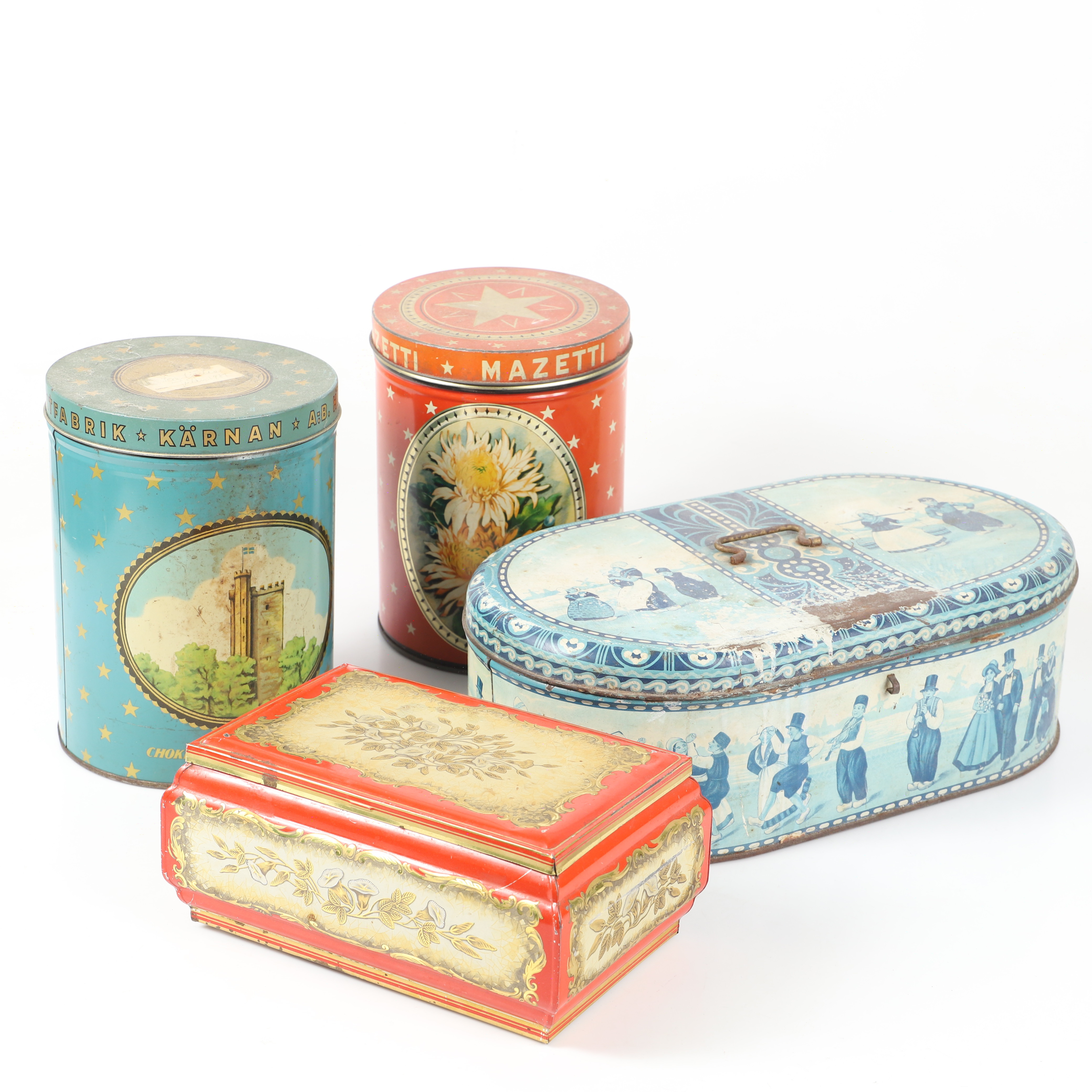 4670857. A set of four lithographed tin cans, 20th century.