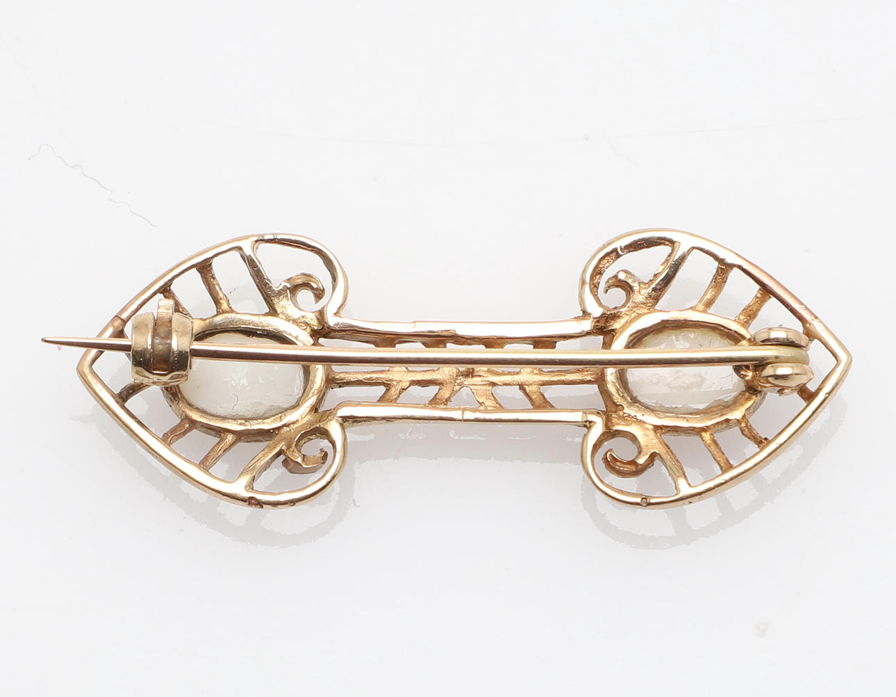 The brooch of open design, set each end with an opal, tests as 9ct gold, 4.2cm, 3.6g.