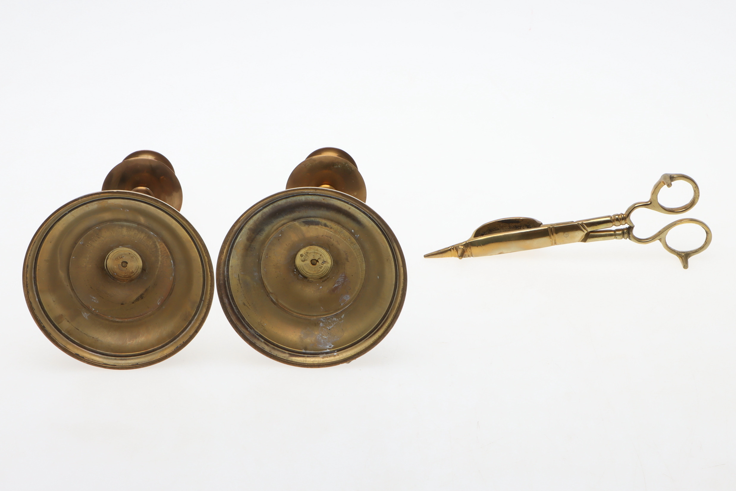 4676900. CANDLESTICKS WITH CANDLE SCISSORS, 3 pcs. a pair, brass, Skultuna, M10, no: 2 and no: 78, 1900-tal.