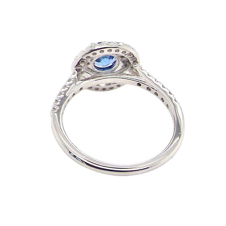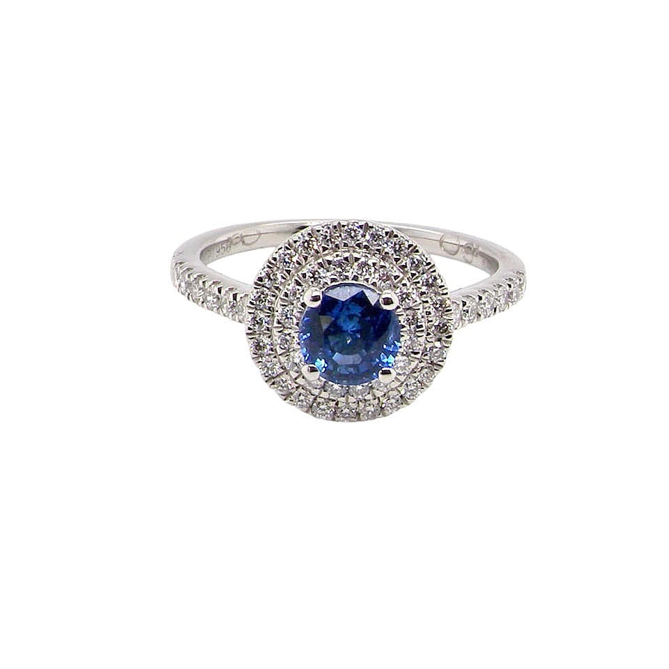 A platinum, cornflower blue sapphire (approx. 0,5ct) and diamond (total approx. 0.95ct) set cluster ring. UK ring size: K. Total weight: 4,3.