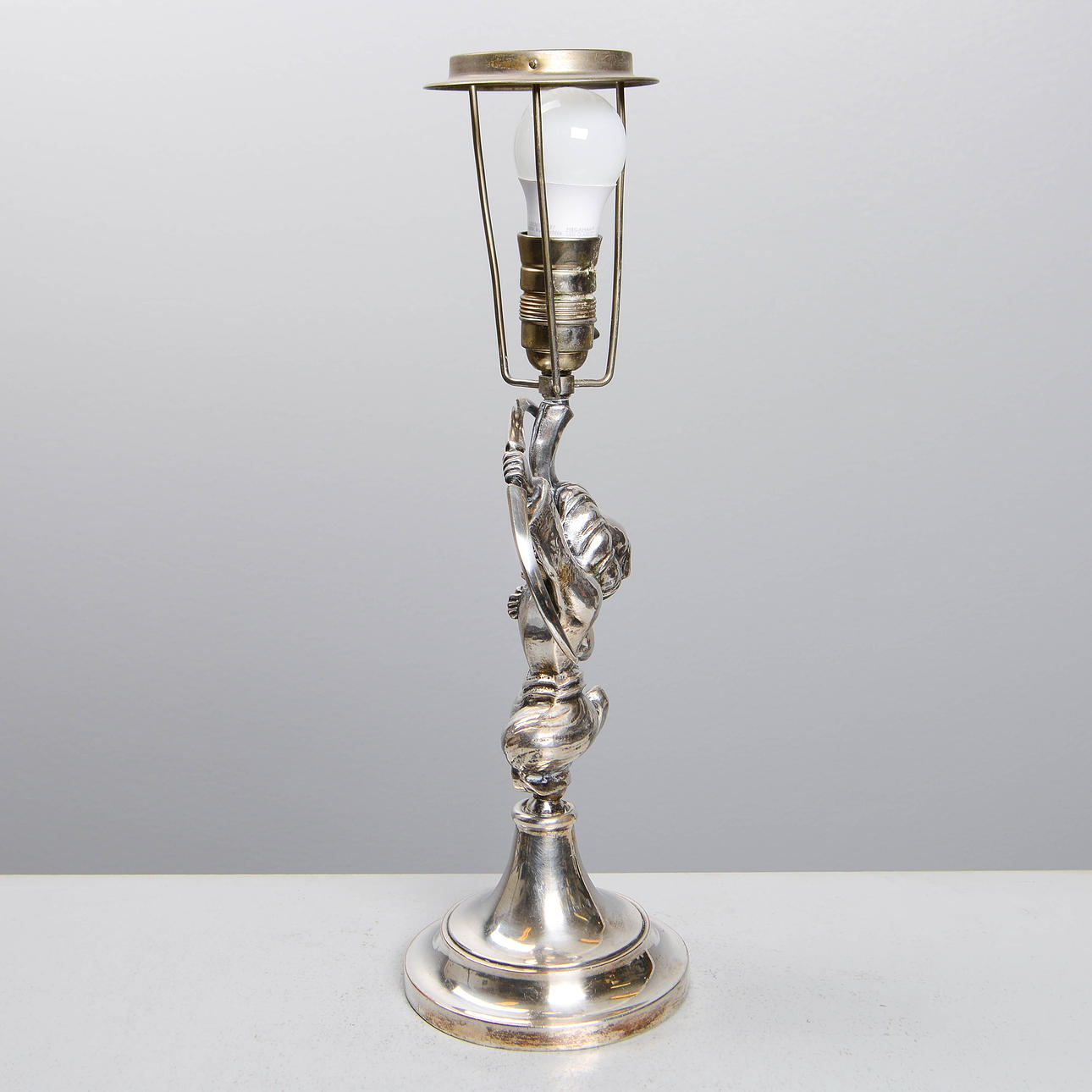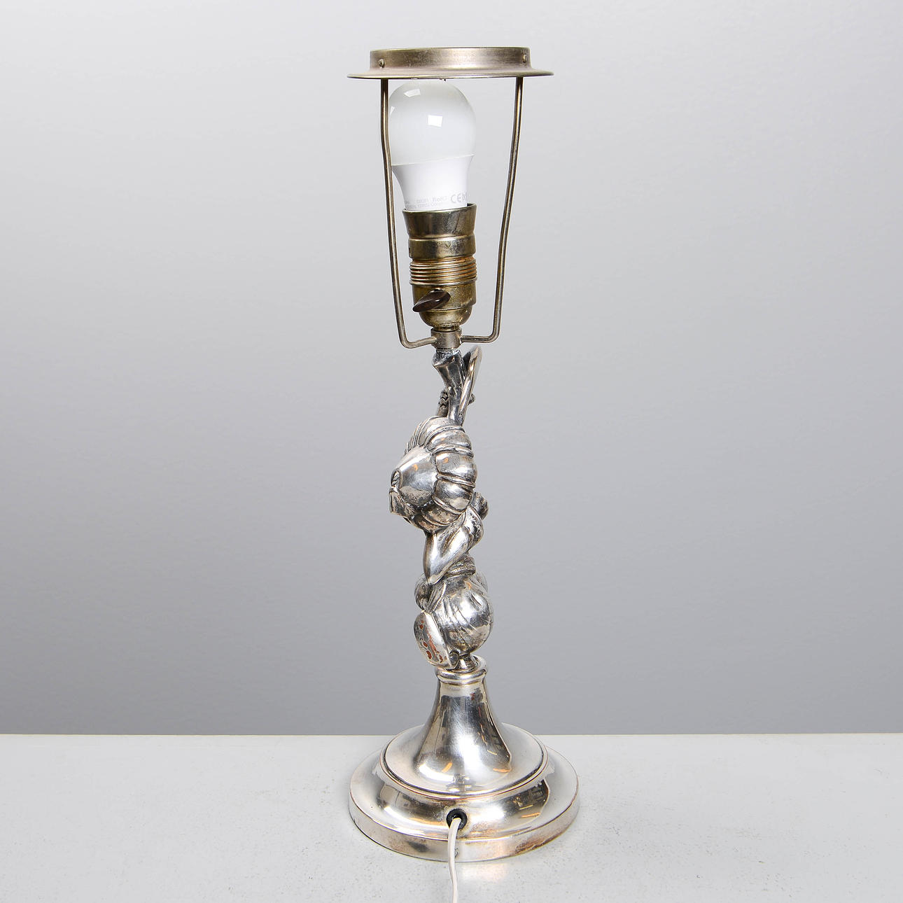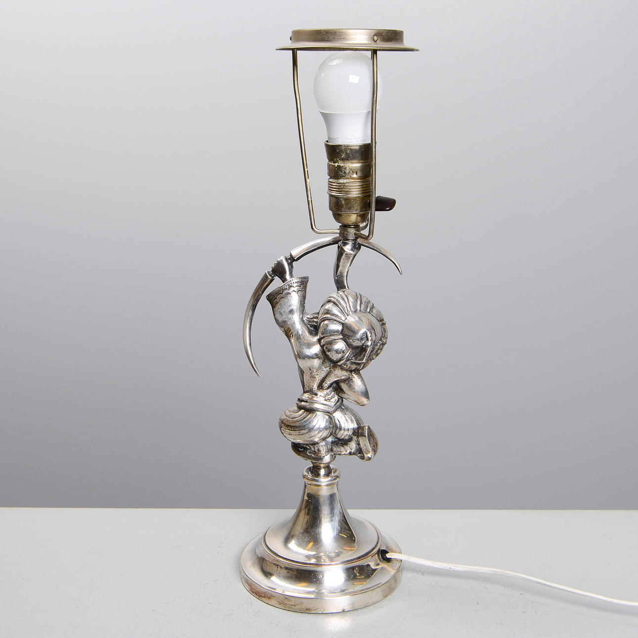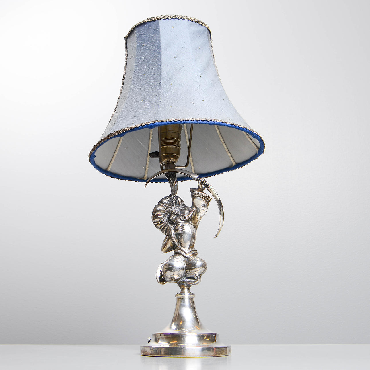 Table lamp in silver-plated metal with oriental motif. Designed by Per Torndahl for Atelier Torndal in the 1920s. Total height: 54cm.