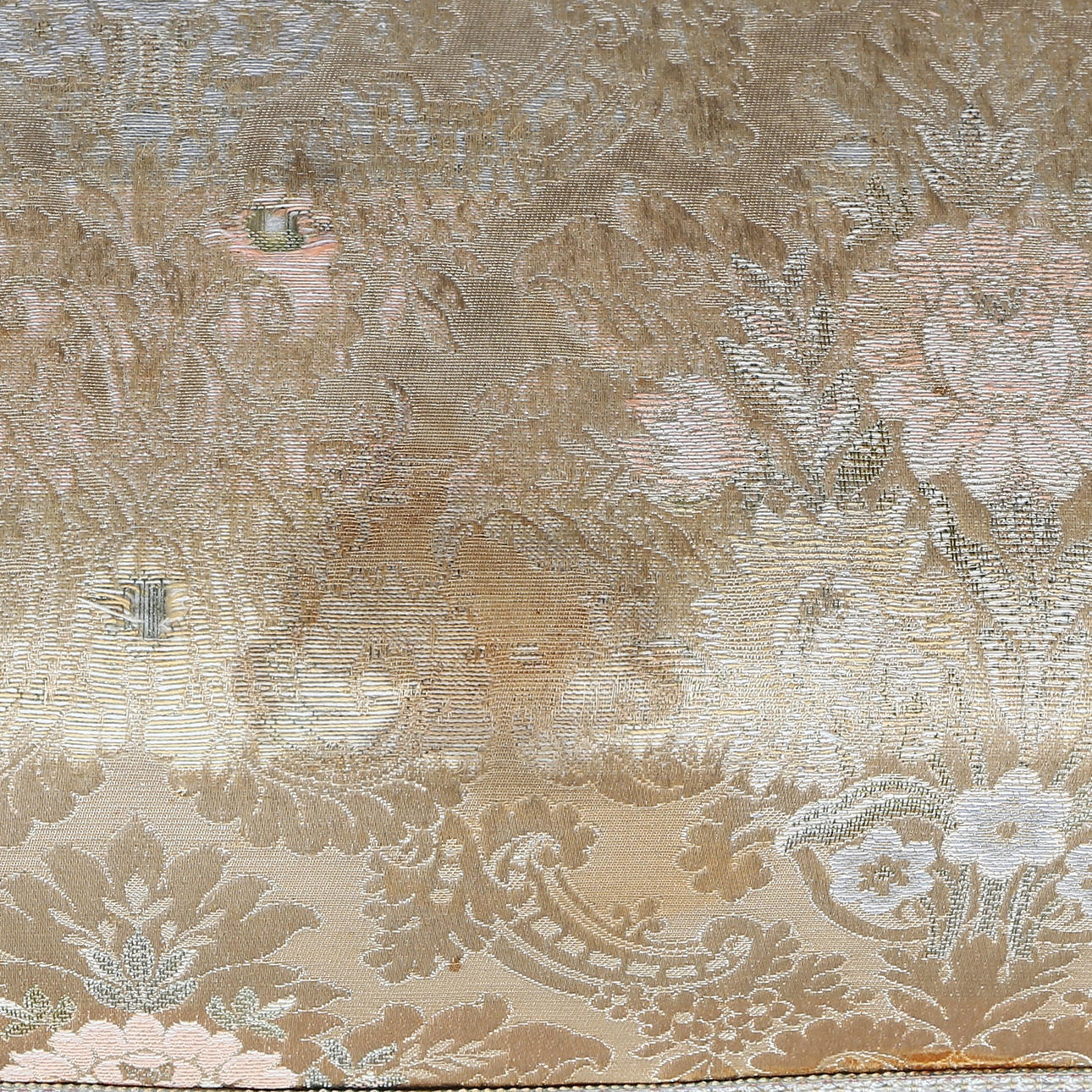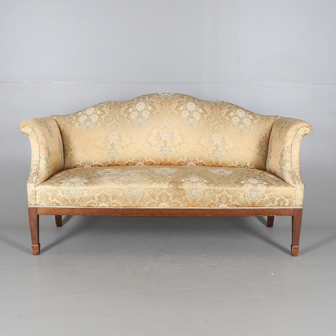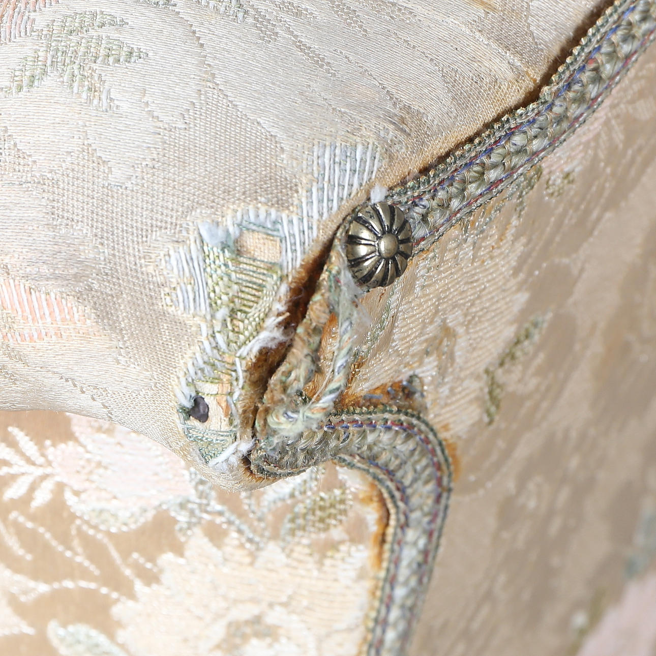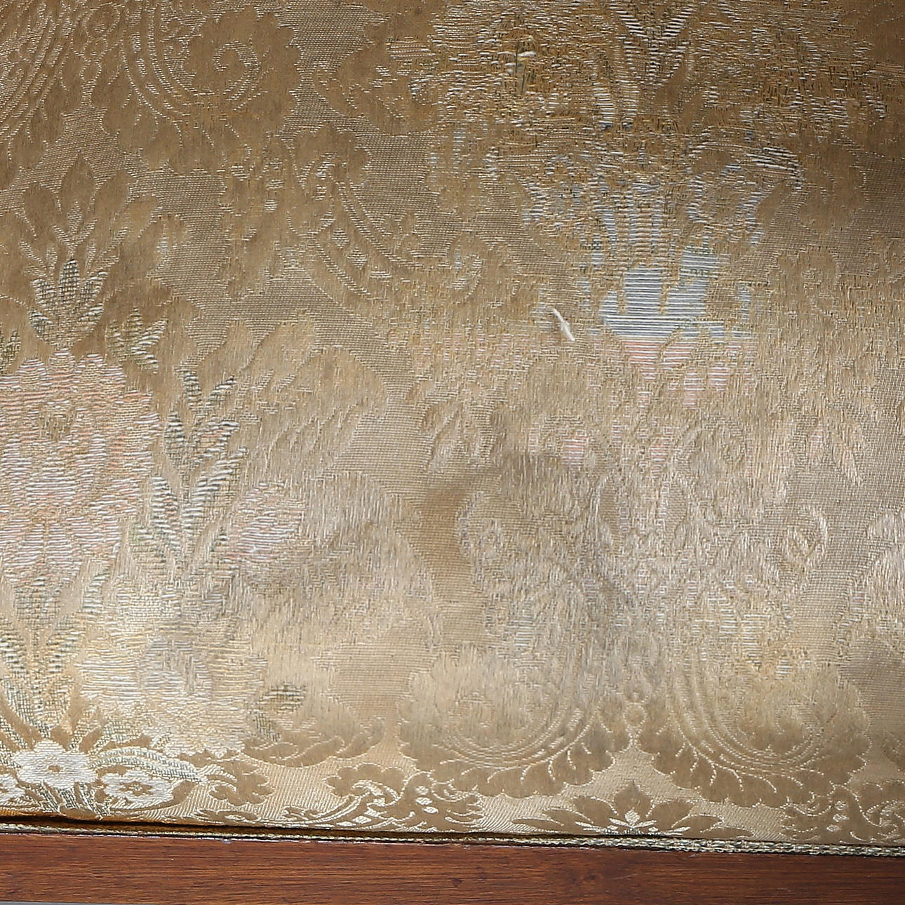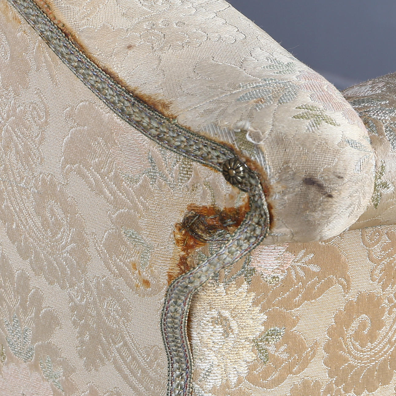 Solid upholstered upholstery with decoration of floral medallions.