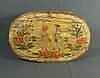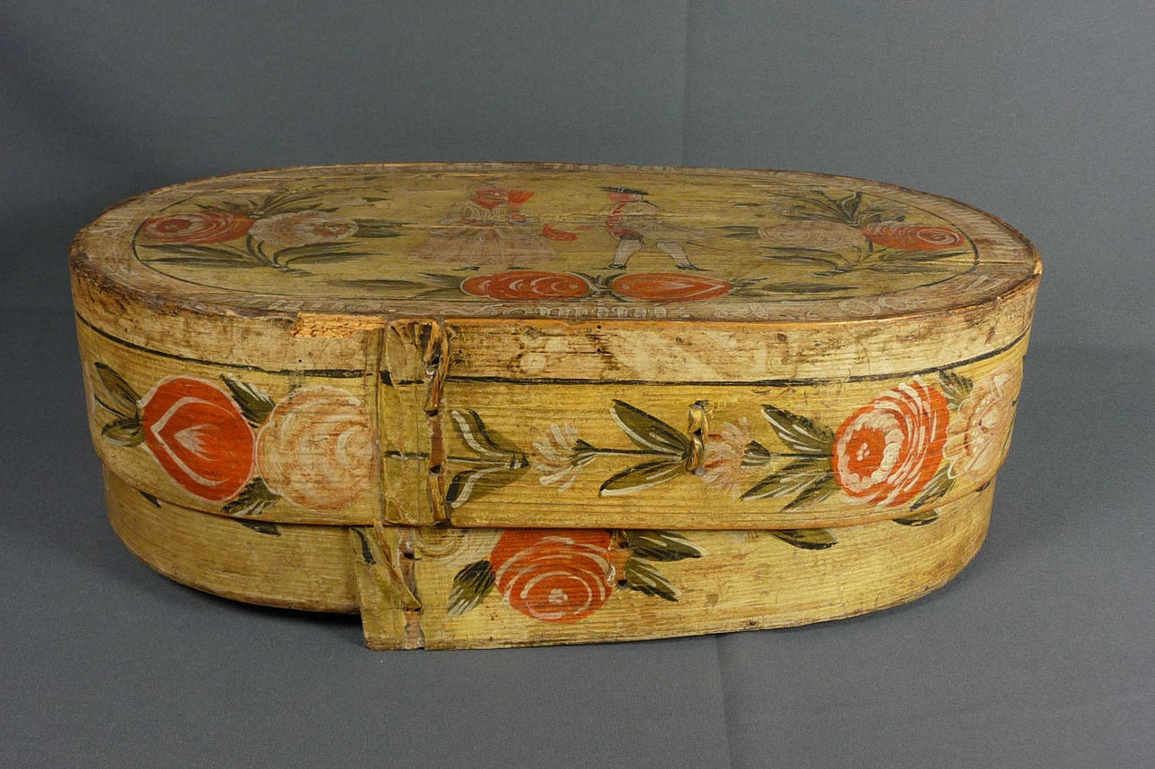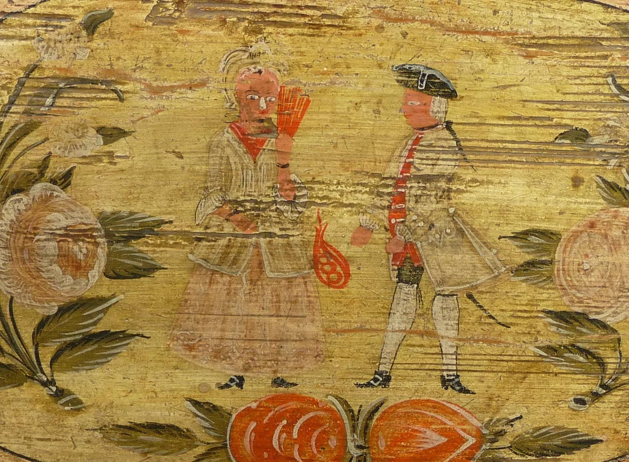 Oval shape, polychrome floral decoration on a yellow background, on the lid a courtly couple with a motto and date. "1790". Wood. 47x30x17cm.