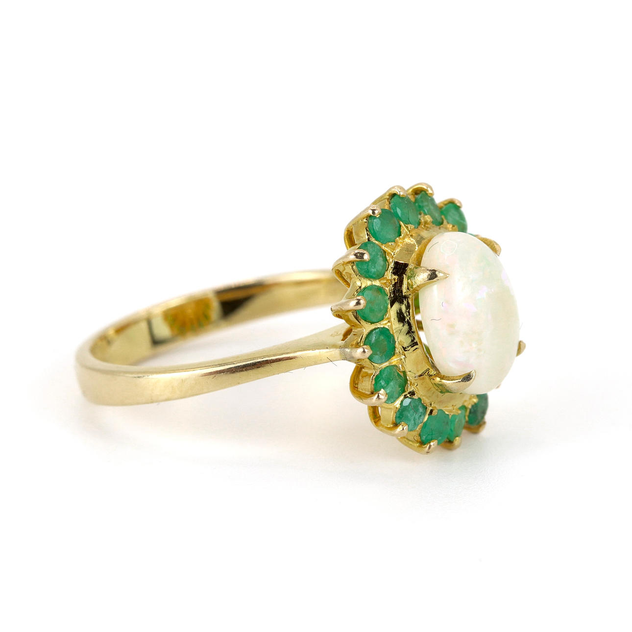 A 14K yellow gold ring set with large cabochon opal surrounded by eighteen small round cut emeralds.